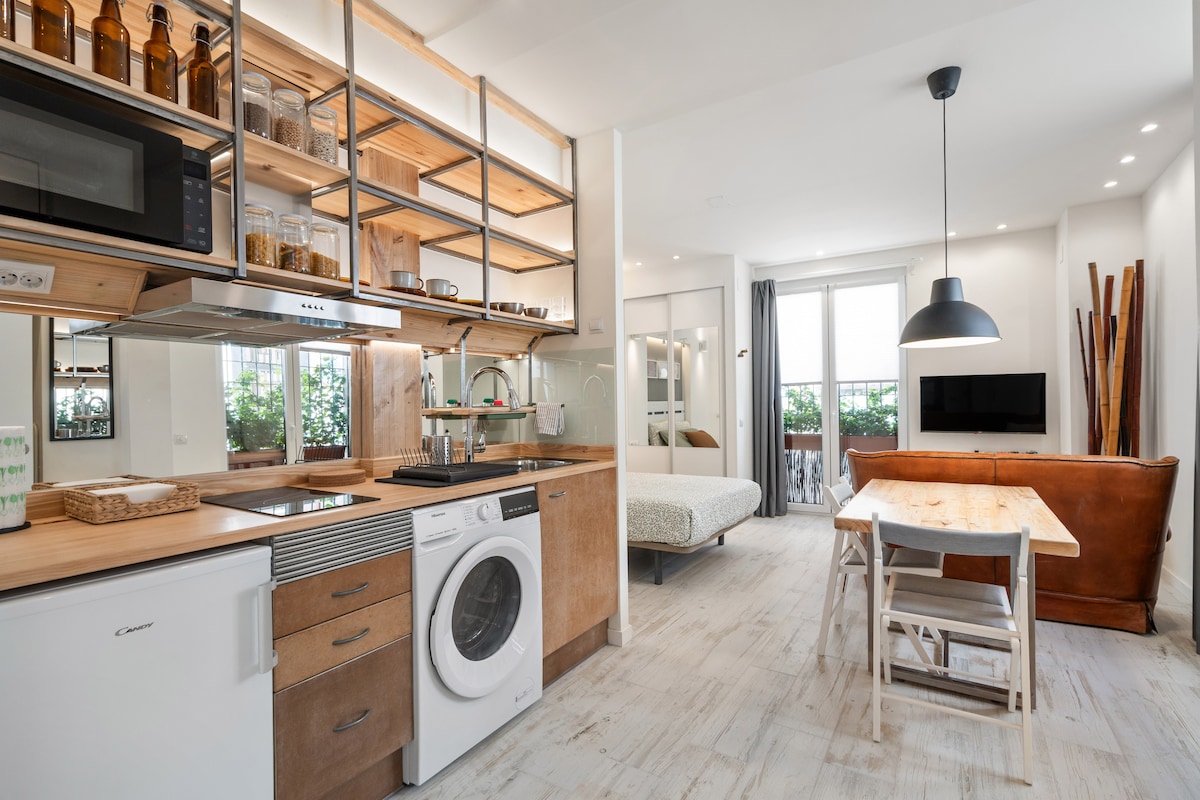 “Vine” apartment is located in Madrid center, off Gran Via, on a quiet street in a new building with elevator. It is nature-inspired, bright & modern, has WiFi, is fully equipped and is very close to restaurants, tapas, the Metro, shops & galleries. Best for a single, couples or couples with a kid! Pets are invited happily!!! The apartment is located in a new buliding, with an elevator! It is modern designed, with lots of greenery, themed to its name, Vine. A huge window along the length of the whole apartment overlooks a beautiful private garden. The apartment consists of a bedroom with a double bed, a living area with a single pull-out sofa, kitchen and bathroom. It has WiFi and is fully equipped, including a washing machine, TV, air conditioning, and Nespresso coffee maker - all just ready for your comfort and enjoyment! The apartment is a studio open space apartment - and it's all yours to enjoy! There are no areas in the apartment that you cannot use or access! We love hosting, but also respect our guests' privacy! We are here for you as much as you would like! Located just off Gran Via in lively buzzing Malasana neighborhood with its great range of authentic cafes, tapas & bars. Huge Zara Primark & Mango are minutes away. Best Madrid sites like Royal Palace, Puerta del Sol & Museums are in walking distance The Central Metro Station Gran Via is a 2 minute walk from the apartment. From there you can take the metro to anywhere you want in Madrid and also to all the train stations that will take you out of Madrid to the rest of Spain. If you come by car, a big parking lot is located at Barco 1, Madrid, just a minute from the apartment. There is also a bicycle-rental station close by. A hosting kit of water, soda, milk, coffee, tea and sweetners will be waiting to welcome you :-)
