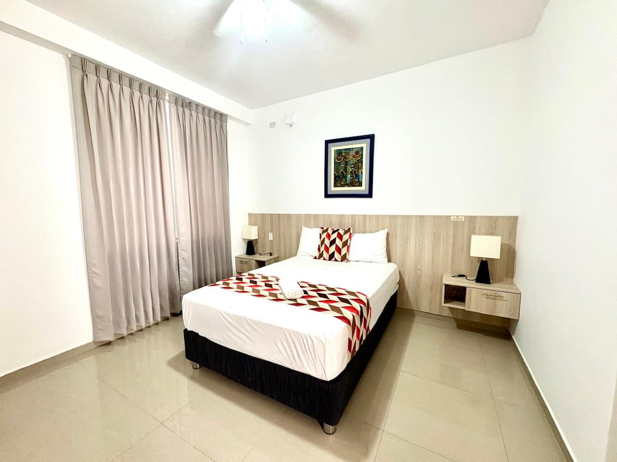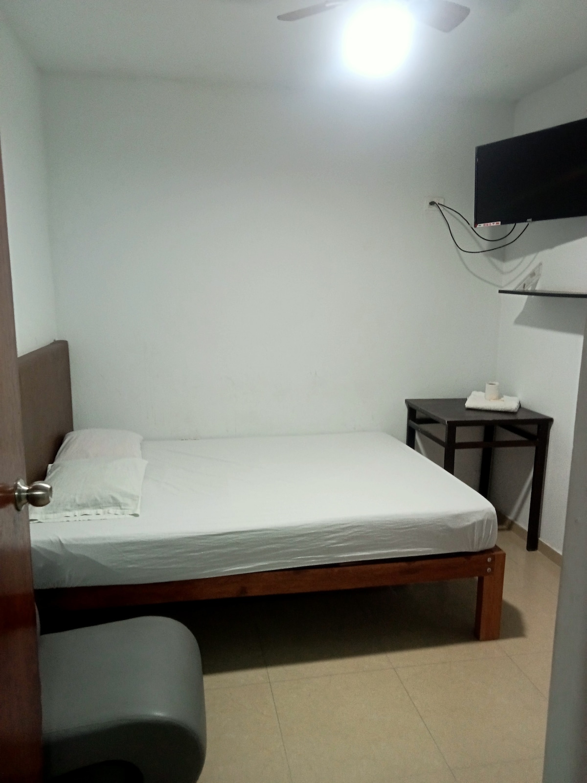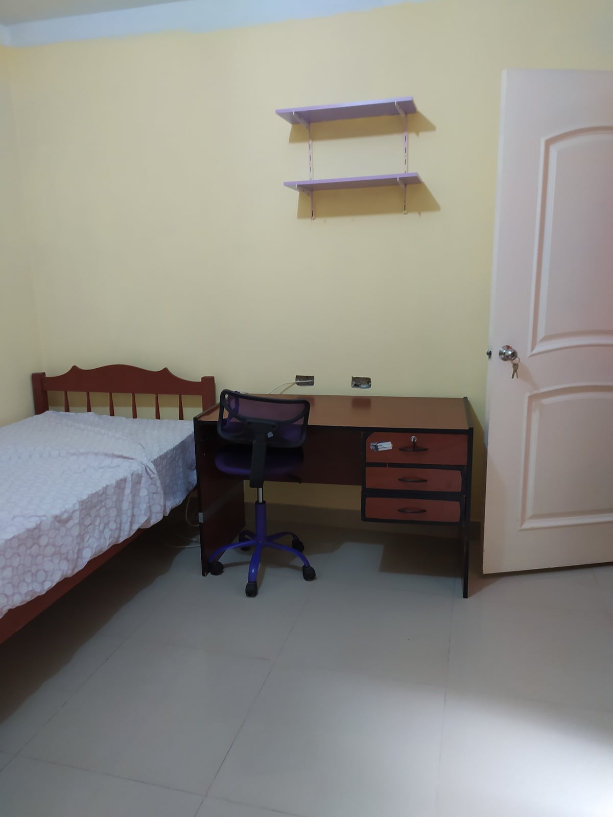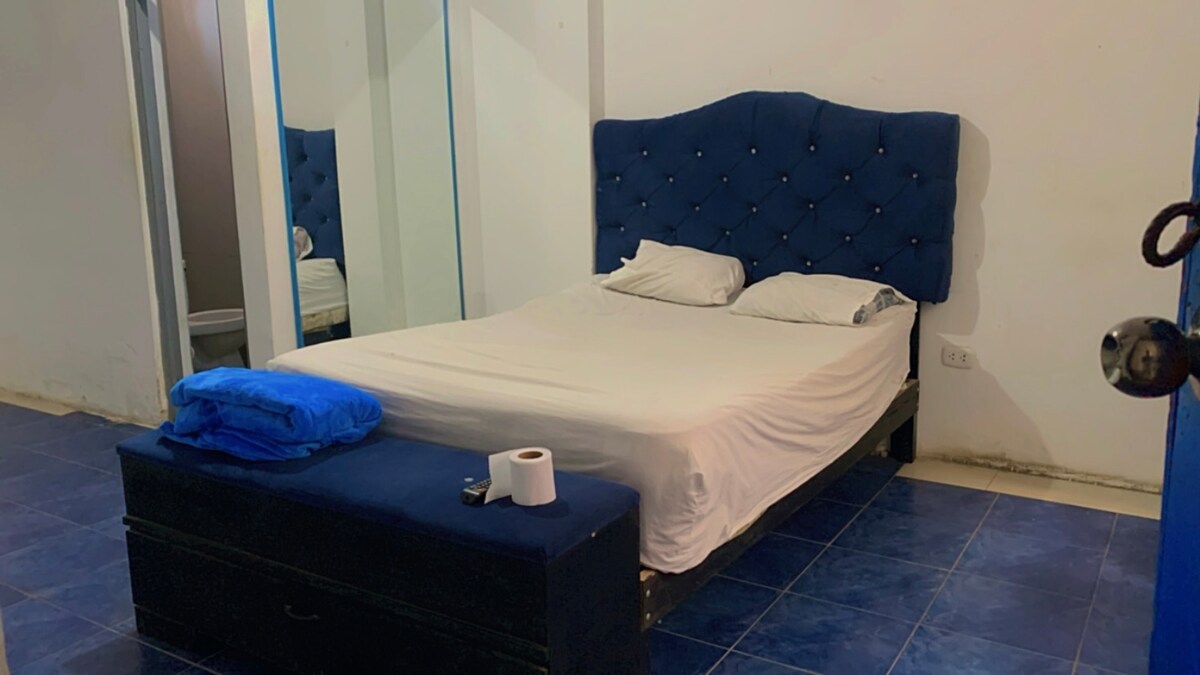 Habitación al interior de una residencia, totalmente acogedora, lejos del ruido de la ciudad, cuenta con lo necesario para un buen descanso. Televisor de 43” Smart conectado al wifi , closet, así como una mesa pequeña con sus dos sillas para trabajo remoto, baño agua fría y caliente. En el lobby tenemos bebidas frías Buscanos como Hotel Palmera verde en Piura
