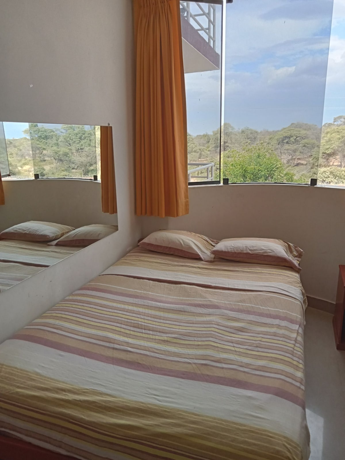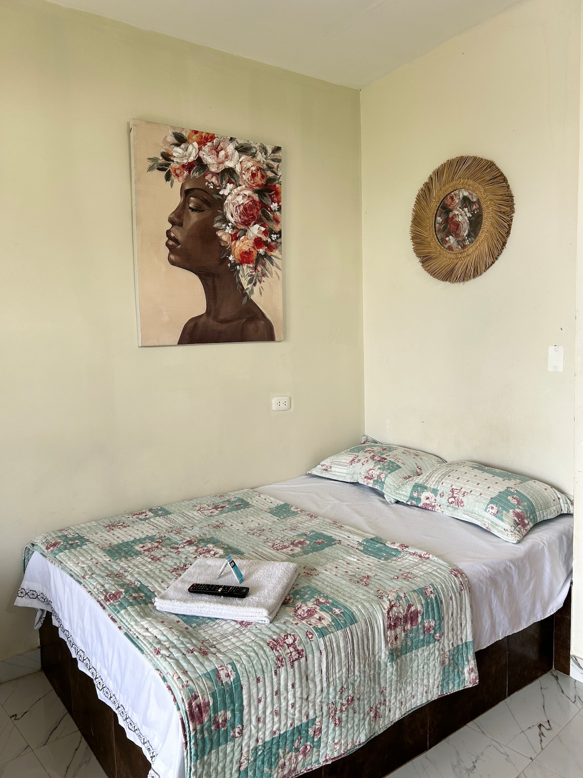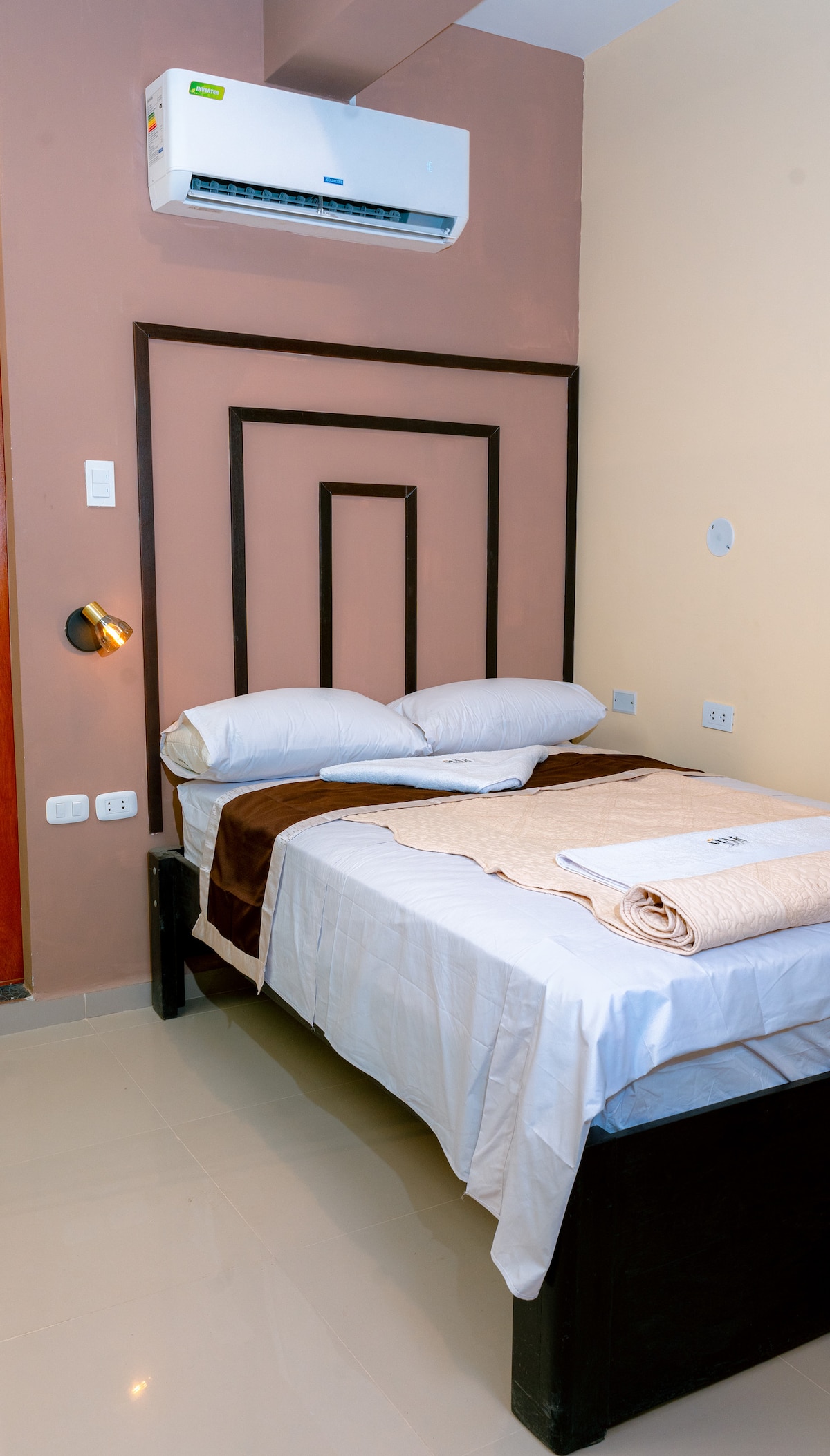Habitación al interior de una residencia, totalmente acogedora, lejos del ruido de la ciudad, cuenta con lo necesario para un buen descanso. Televisor de 43” Smart conectado al wifi , closet, así como una mesa pequeña con sus dos sillas para trabajo remoto, baño agua fría y caliente. En el lobby tenemos bebidas frías Buscanos como Hotel Palmera verde en Piura