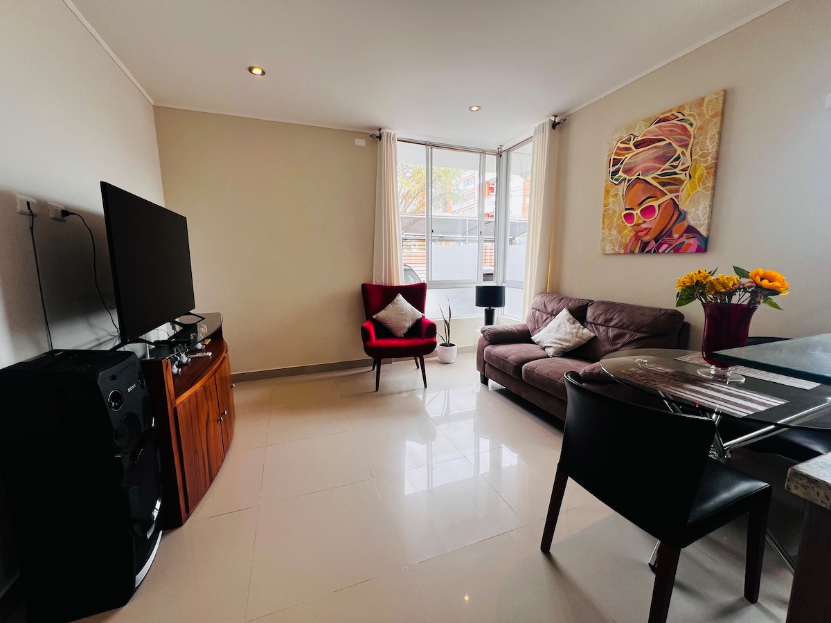 UBICADO EN URBANIZACION CERRADA Y SEGURA. Relájate y disfruta de este cómodo y funcional apartamento con amplia terraza y hermosa vista de Sunset. Conversa con Alexa y desayuna o almuerza respirando el aire fresco de un cuarto piso. Siéntete como en casa con todos los electrodomésticos a tu disposición y disfruta del streaming con la seguridad de hospedarte en una Urbanización cerrada y vigilada. A 5 minutos del Mall Plaza y 15 minutos del aeropuerto, será imposible llegar tarde.