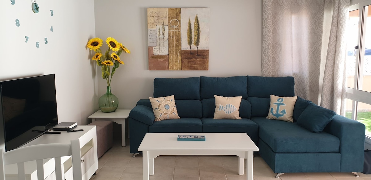 Comfortable and spacious with your private garden and sunbed ready for your best tan. Sunny terrace for dining or smart working with the palm and pool view. Swimming pool quiet and waiting for guests. Fully equipped kitchen, big new super fridge for your good cooking time, hot water. Big double bed in a bedroom and bed sofa for 2 in the saloon. 4 playas are 20 minutes walk as the Atlantico Mall handy on 2 km from apartment complete with all best shops. Golf club 5 min walk.