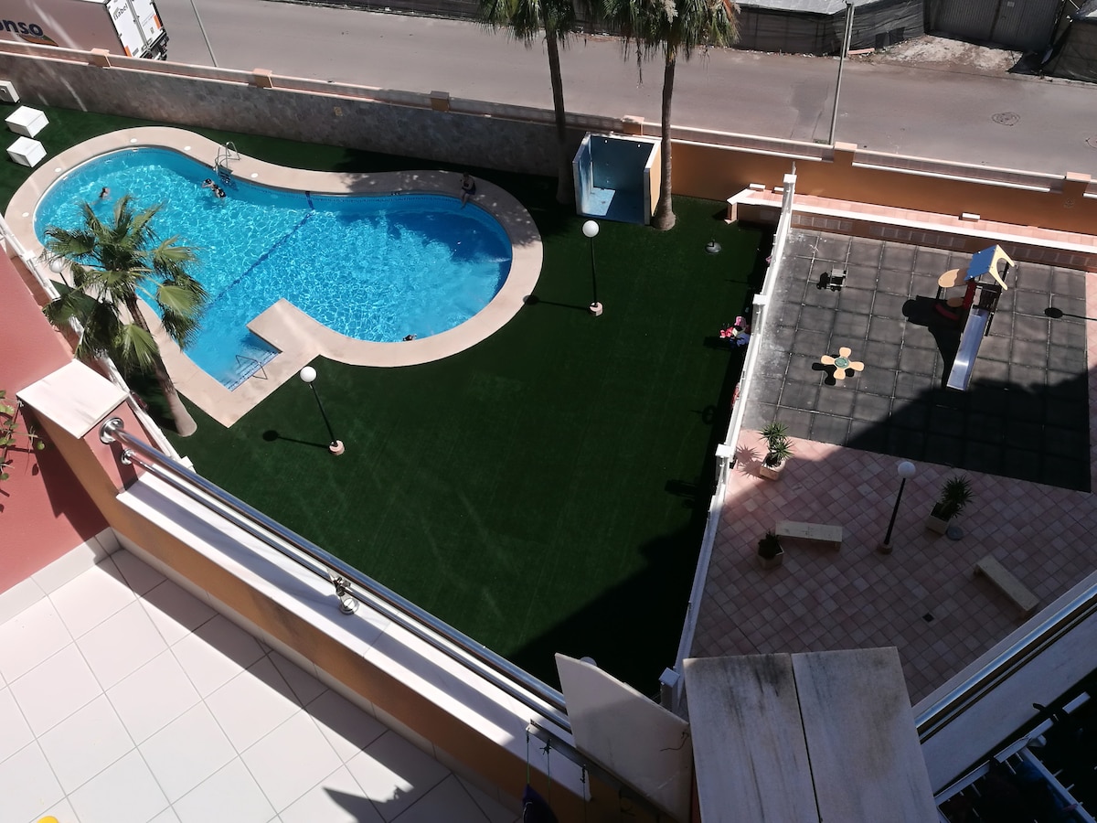 APARTAMENTO RENOVADO Se trata de un precioso espacio donde hemos cuidado hasta el mas mínimo detalle para hacer sentir a nuestros huéspedes como en casa. La vivienda esta equipada con todo lo necesario para disfrutar de unas relajadas vacaciones. Se encuentra detrás de la playa y paseo, junto a los sitios de ocio. Además cuenta con dos piscinas para niños y adultos, zonas comunes, patio exterior y una amplia terraza para cenar.