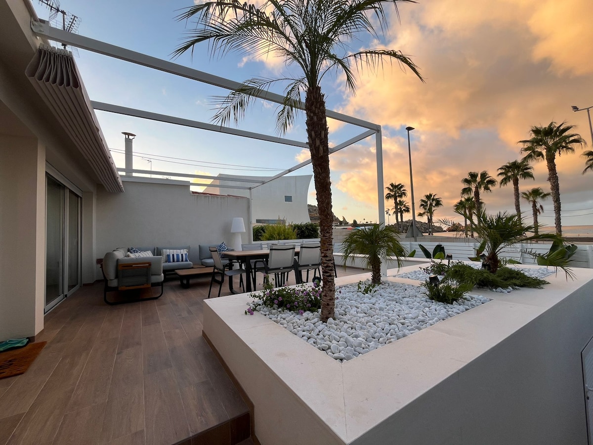 Discover Siroco, an exclusive apartment right on the beachfront of La Colonia in Águilas. This elegant accommodation strikes the perfect balance between comfort and luxury, featuring three spacious bedrooms, two modern bathrooms, a fully equipped kitchen, and a spectacular terrace with sea views. Located just 10 meters from the beach and within walking distance of the town center, you'll have restaurants, shops, and a vibrant cultural scene right at your fingertips.
