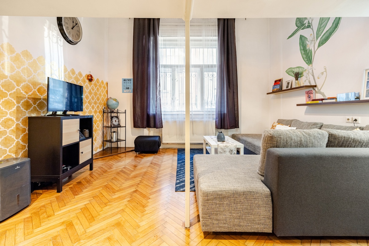 Location is the epicentre of Budapest, 20 meters from the Chain Bridge. The 150 years old, listed house was designed by the same architect as the Parliament and has a decadent, old beauty while the apartment is very simple and basic, a bit industrial but feels home immediately. The flat looks onto a green, inner courtyard between houses. Split air conditioner from 5 June 2025.