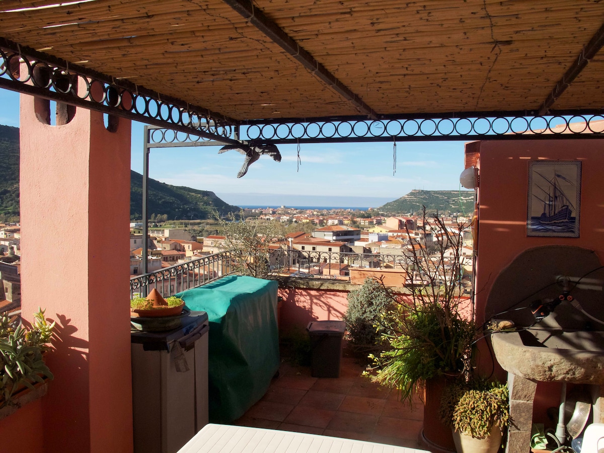 Our charming rooftop apartment is nestled just a few streets away from the 13th century Castello overlooking this medieval town. A stone's throw from the centre of Bosa t in a peaceful traffic-free street , this apartment has stunning views over the town, river and across the valley. Sip morning coffee while you breathe the scent of fresh country air and listen for the sheep bells tinkling. Pack your most comfortable footwear for exploring the cobbled streets. Cotton sheets and towels included.
