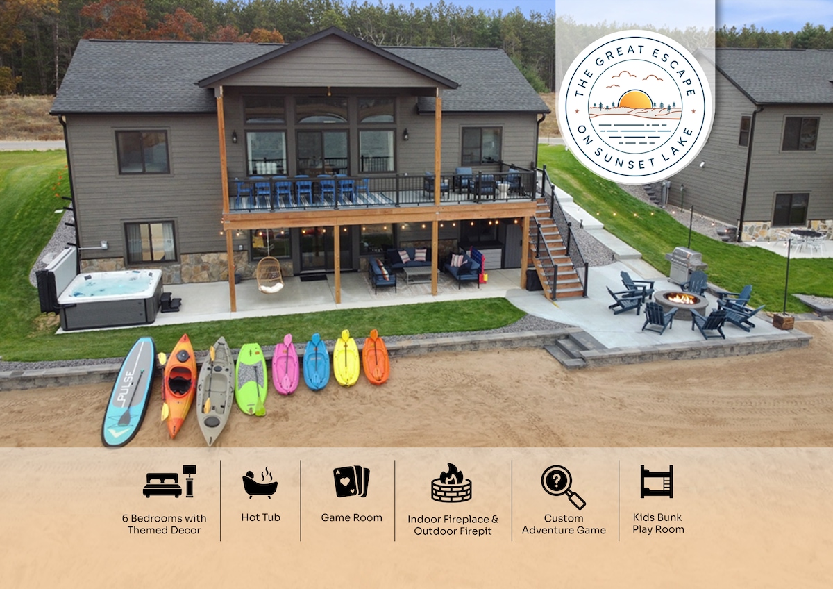 Experience the ultimate beachfront retreat with a stunning lakeview, luxurious hot tub, screened porch, private sandy beach, and a cozy fire pit under the stars. WisCottage is a luxurious 5-bedroom vacation rental promising an unforgettable escape with breathtaking lake views, indulgent amenities, and endless opportunities for relaxation and adventure. This premier beachfront retreat is nestled conveniently near the picturesque shores of Castle Rock Lake and Wisconsin Dells.