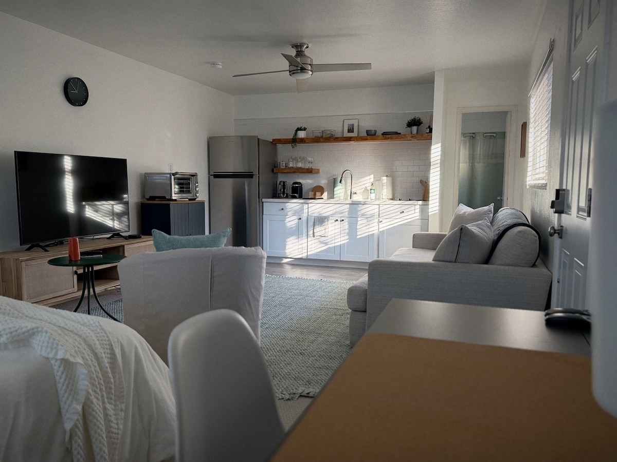 Fully remodeled private studio designed for both comfort and peace of mind! We lived here for a year before hosting, so I can confidently say it's safe & welcoming. Enjoy the beautifully updated bathroom with a rainfall shower head, and sleep soundly on a luxurious Eclipse Glacier KING bed with four Sealy pillows. Modern amenities include: - 58" Smart TV - Free Wi-Fi - New Washer & Dryer Conveniently located near Phx Sky Harbor Airport and 25 mins from State Farm Stadium.