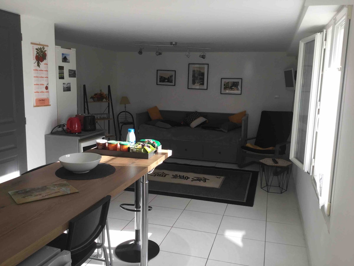 Petit studio dans maison individuelle située dans un quartier calme . Proche du centre ville , (boulangerie est à 1 km centre ville à 2km. Lignes de bus (arrêt en haut de la rue soit100m) Bus urbain gratuit .La cuisine est équipée d une plaque à induction , four micro ondes , cafetière , grille pain , bouilloire et lave vaisselle. Stationnement sur le terrain . Entrée indépendante avec petite terrasse. Une boîte à clés permet l arrivée à votre convenance.