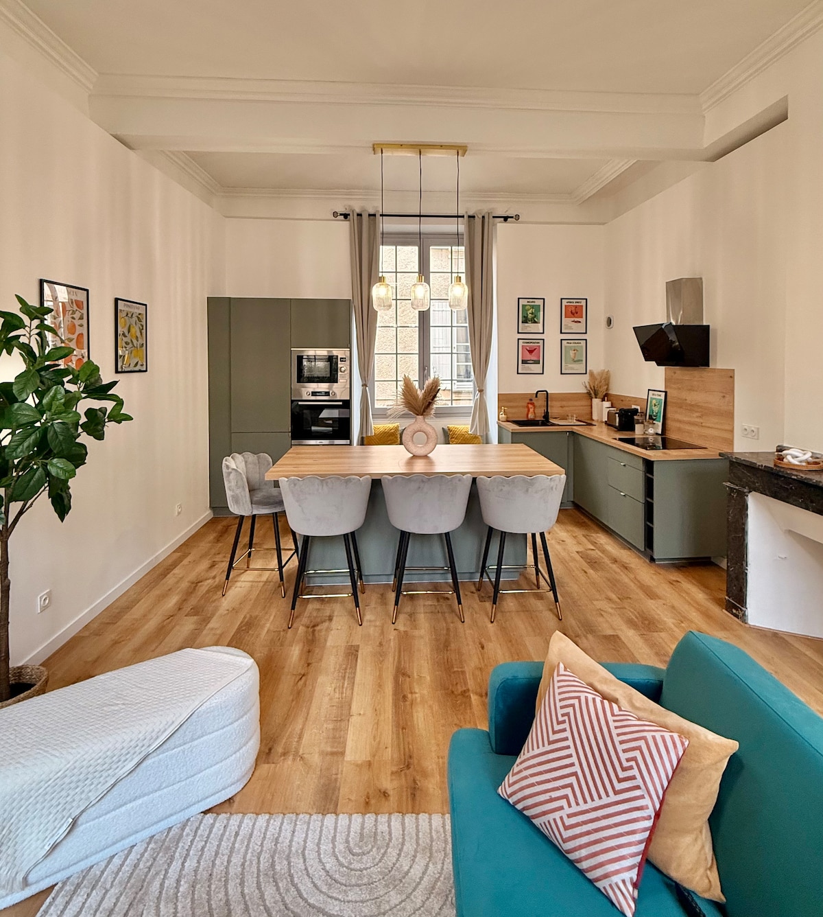 Scandinavian-inspired, this apartment has been designed so that you can share it between friends, family but also between work colleagues, by modulating the place to your convenience. The high ceilings and rounded windows give you will allow you to benefit from natural daylight but will give you also the feeling of being in a unique place. Cook, watch TV, eat, drink coffee, relax, but Above all, enjoy this unique place!