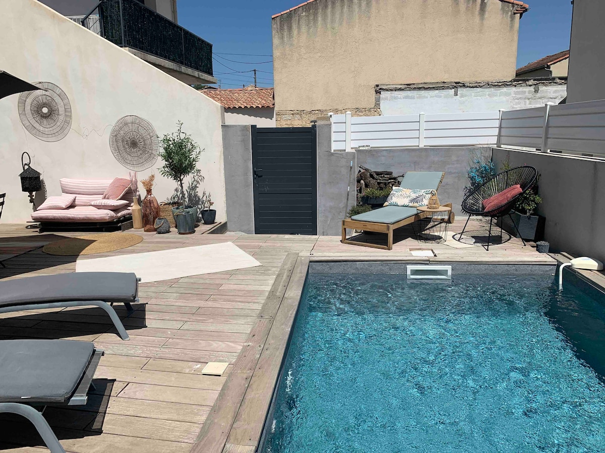 Détendez-vous dans ce logement calme et élégant. Situé à Sussargues dans l'Hérault, au coeur des vignes et de la Garrigues, à 25 min de Montpellier et de la plage, dans un petit village avec toutes commodités, ce studio saura vous faire voyager grâce à sa décoration. Le studio est attenant à notre maison où nous habitons avec nos 2 enfants. Piscine agréable, traitée au sel, à l'abri des regards. Jardin et grande terrasse.