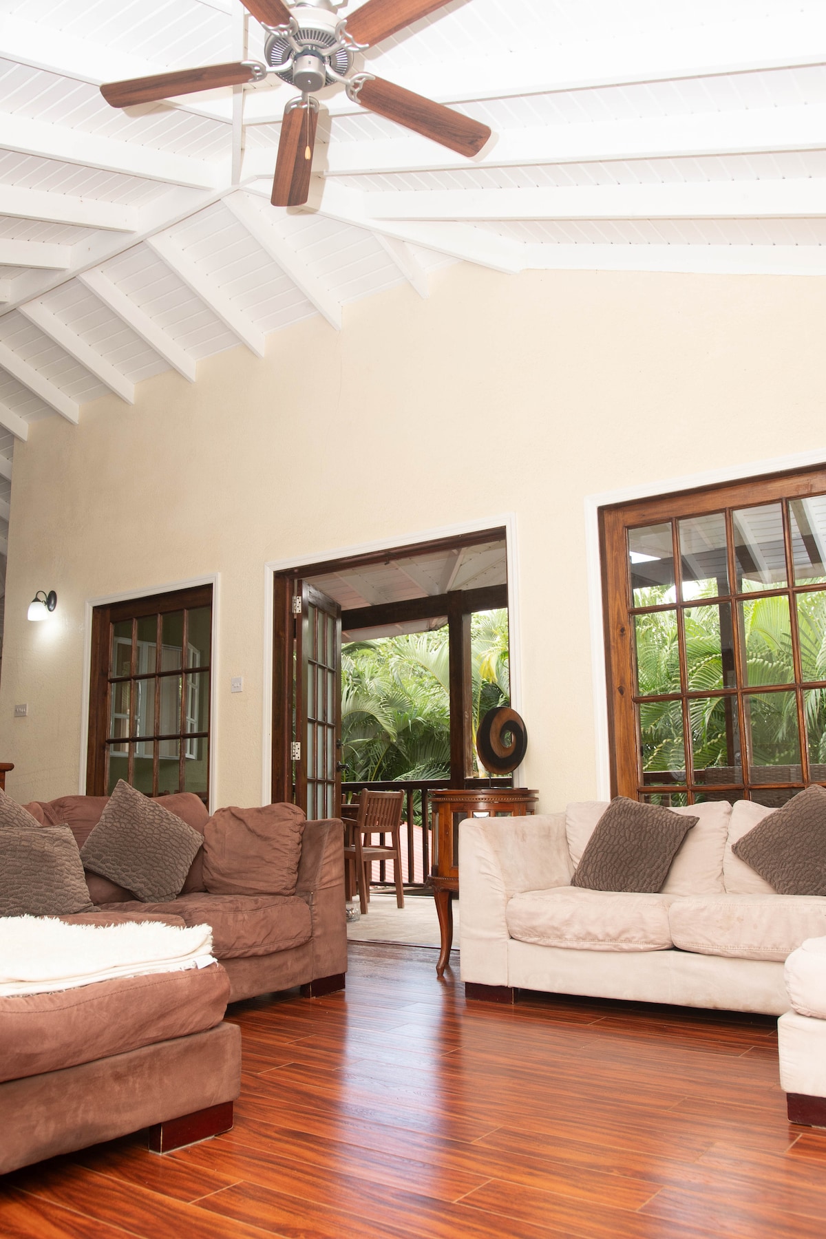 Come be refreshed on this family estate located on 4 lush tropical acres of land with magnificent views of the the north and the neighboring island of Martinique. Enjoy the most amazing sunsets on the sprawling patio. Despite its tranquility, the property is ideally located less than 10 min drive from Castries city, and some fine beaches. 2 min walk up our driveway and you are on the bus route. Within a 10 min walk are a bakery, mini mart, bars, restaurants and food vans. All yours to enjoy.