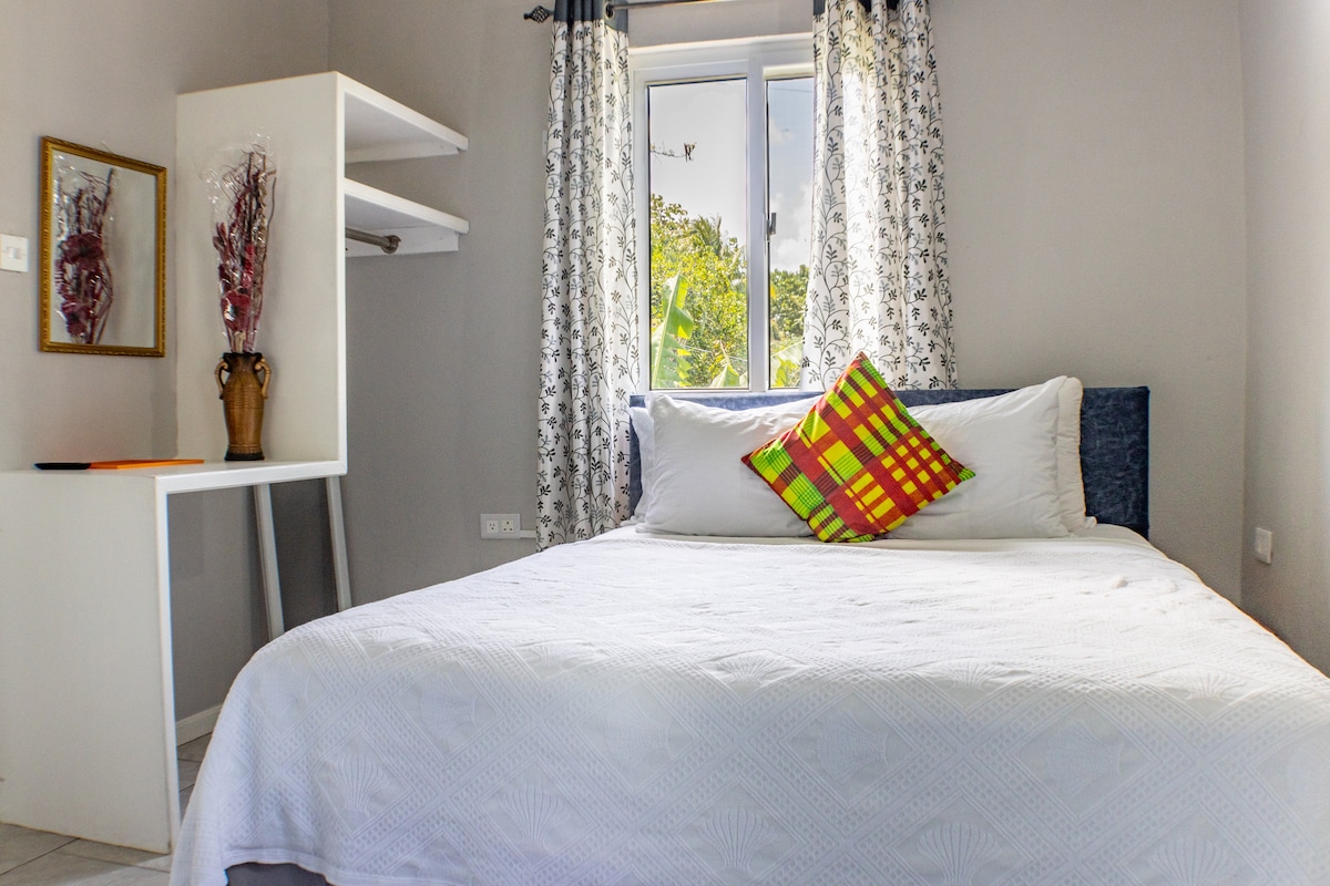 Corner House Apartment is merely four minutes drive or just about ten minutes brisk walk to the city centre. There is a reliable bus system right outside the parking lot. Buses run from 7:00 am till 11:00 am and re commence at 2:30 pm till 9: 00 pm. Ideal for guests coming in on the Ferry or checking in at GFLCharles Airport. Great for couples, solo adventurers, and business travelers The apartment is private, cosy and comfortable. The airconditioned bedroom gives it quite an added charm.