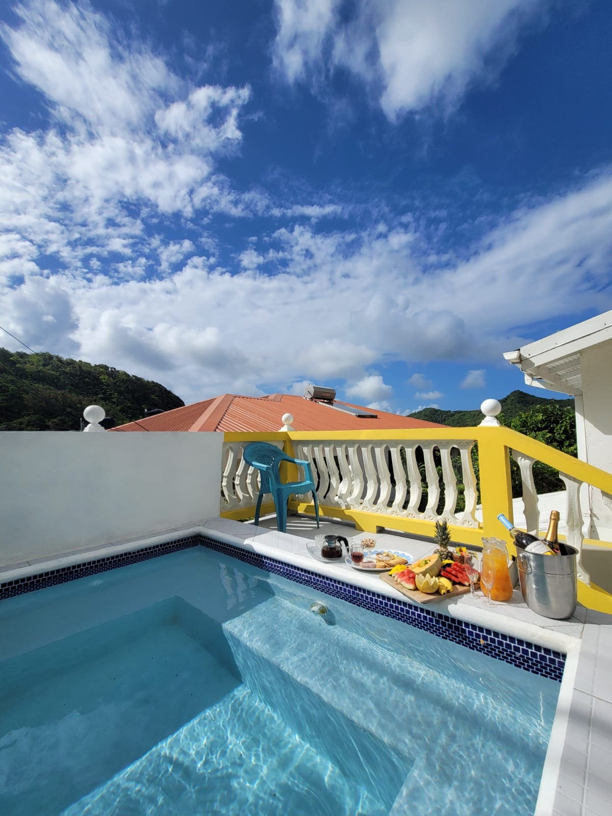 Ti Kas is all wood, with one bedroom, a double bed, complete kitchen, saloon with smart TV with WIFI connection & sofa. One toilet inside & bath on the balcony. From the guest balcony there's a wonderful view of the ocean & neighboring Martinique. Lush greenery & birds surrounds our property, including seven varieties of mangoes, Lime, Lemon & sour orange trees. Yoga & mediation place is available. Please see pics for more.