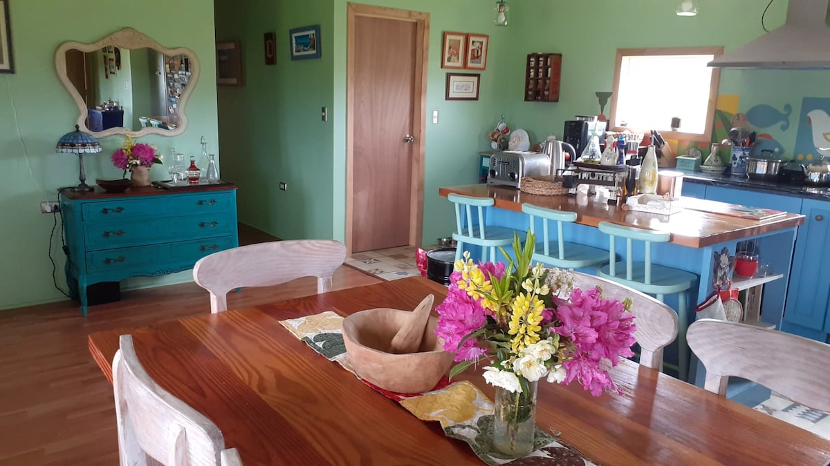 Well-equipped cozy house, located on the outskirts of Dalcahue. Each room is set and decorated with "Chiloé" style, central heating (so, no cold temperature at home!!) and impressive panoramic view of the channel and of the surrounding countryside and hills.