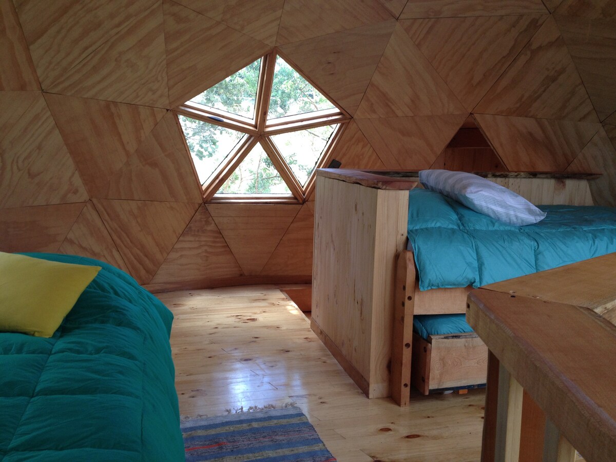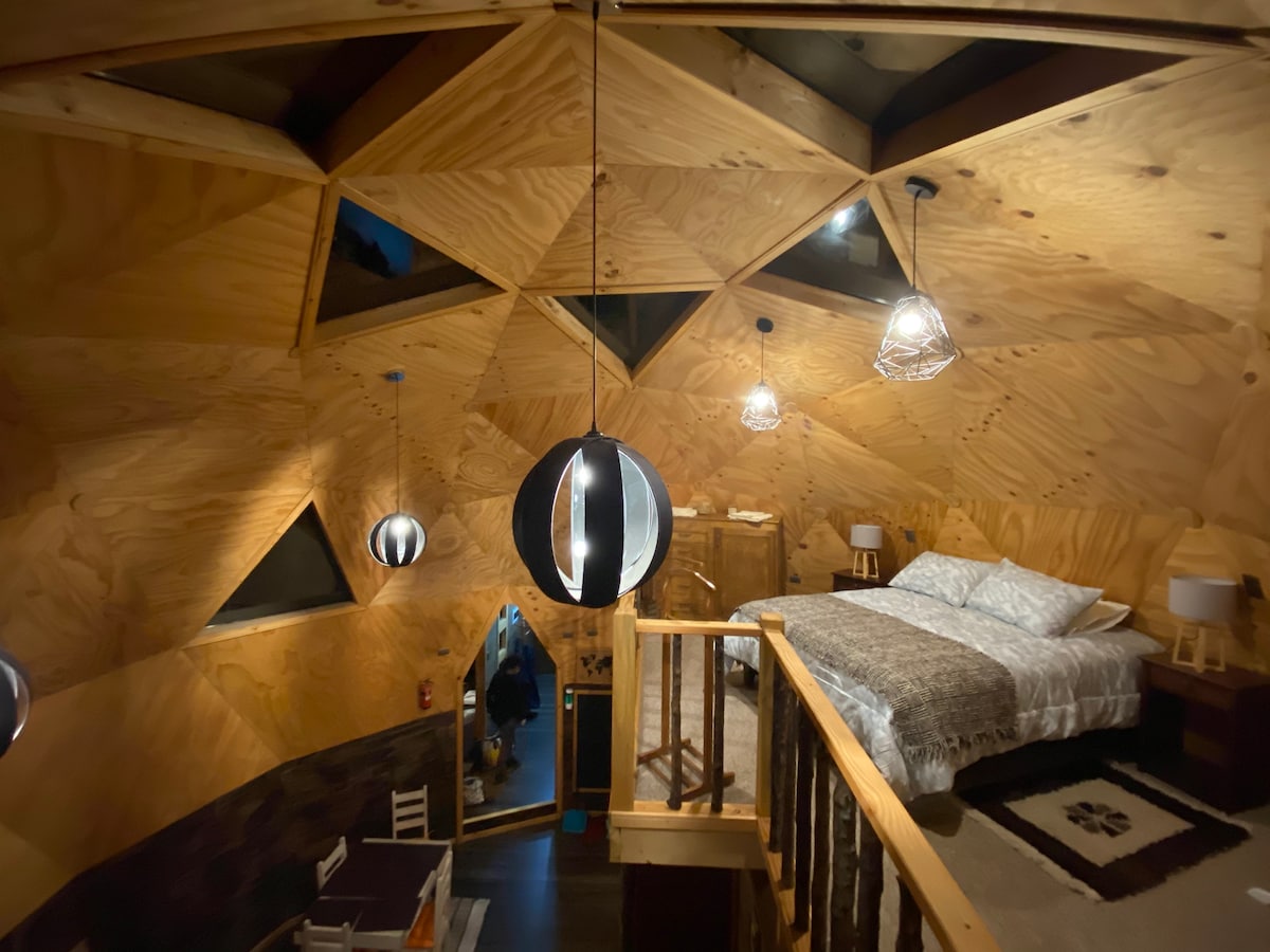 Domo geodésico completamente equipado hasta 4 personas. Espacio único y acogedor que cuenta con 1 cama matrimonial, 1 cama de una plaza en altillo (ideal para niño o adolescente) y 1 sofá cama. Cocina equipada con lo básico para la estadía, calefacción por aire acondicionado y wifi. Sistema de agua caliente por termo eléctrico; promovemos el cuidado del agua, por lo que solicitamos duchas cortas. Ideal para descansar y conectar con la naturaleza.