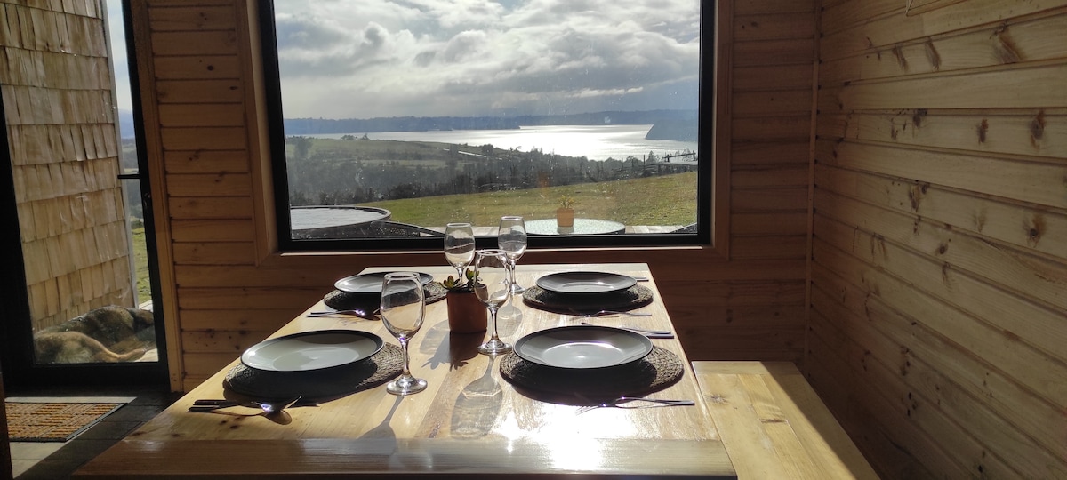 Hermosa cabaña en medio de Chiloé rural. La cabaña está situada específicamente en Teguel Bajo, una pequeña comunidad a 4,5 km de la ciudad de Dalcahue. Se trata de un lugar en medio del campo, rodeado de bosques nativos, a pocos metros del Humedal de Teguel y con una preciosa vista al canal Dalcahue. En el primer piso hay un amplio espacio en donde está la cocina, living, comedor y el hot tube. En el altillo está la habitación principal con una cama de 2 plazas.