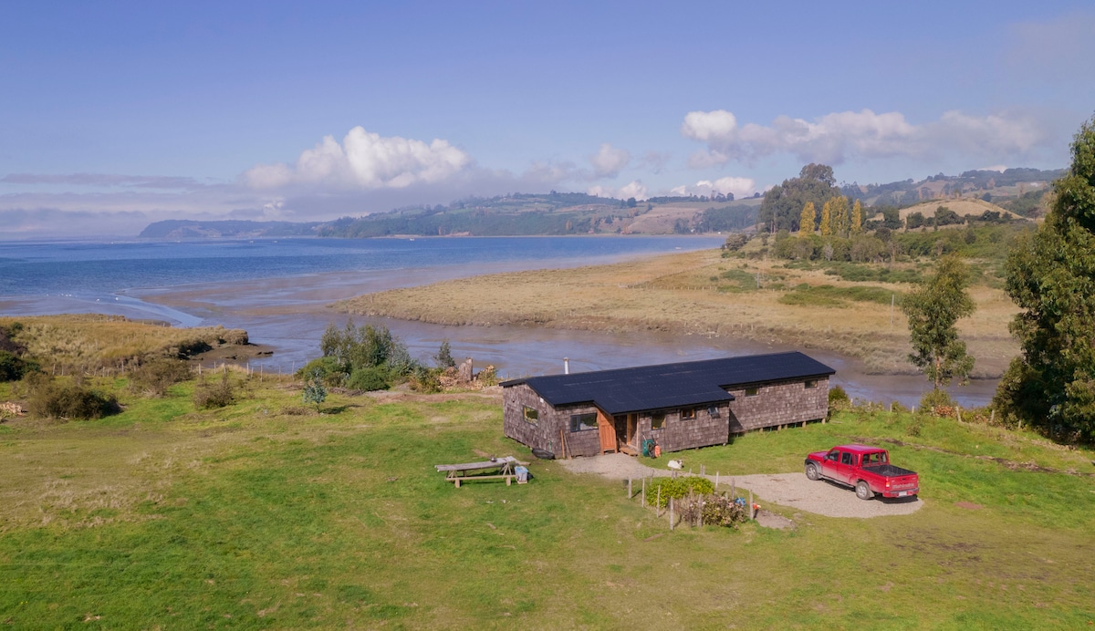 Escápate a este refugio autosustentable en Achao diseñado por Edward Rojas. Vistas al mar desde cada rincón y Hot Tub privado para el descanso total. Tu día aquí: remar en SUP, leer junto a la estufa a pellet, ver cine en el proyector o tocar guitarra junto a un fogón sin humo. Con WiFi, pequeño escritorio y fácil acceso: a 5 min del pueblo y 40 min del aeropuerto. Un entorno de paz, a 5 min caminando a la playa! Ideal para 2-3 personas que buscan volver su equilibrio en este entorno mágico.