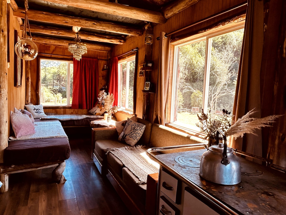 Acogedora cabaña tipo tiny house ubicada en las cercanías de la Laguna Pastahue, rodeada de bosque nativo, a solo minutos de Castro. Ideal para parejas o familias que buscan tranquilidad, naturaleza y una experiencia auténtica en Chiloé. ✨ Incluye: • Tinaja caliente SOLO el 1er día, después se cobra $25.000. • 1 saco de leña para mantener la temperatura de la tinaja. 📍 Ubicación privilegiada: • A 600 metros de Laguna Pastahue • A 700 metros del río San Pedro
