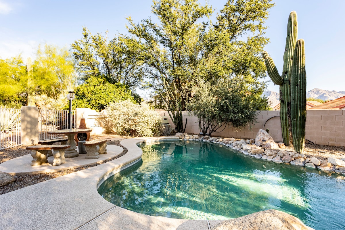 Big comfortable home with lots of light & personality. Heated Pool & spa (extra) all the comforts of home. Master suite features Jacuzzi tub, deck, & futon in the sitting room. Dining options include outdoors to watch the sunrise over the Catalina Mountains. Relax after adventuring in front of the big screen smart TV, enjoy provided games, videos or books, go for a late night swim, or sit around the fire pit & enjoy the stars, away from city lights. No unauthorized parties. Not a party rental!