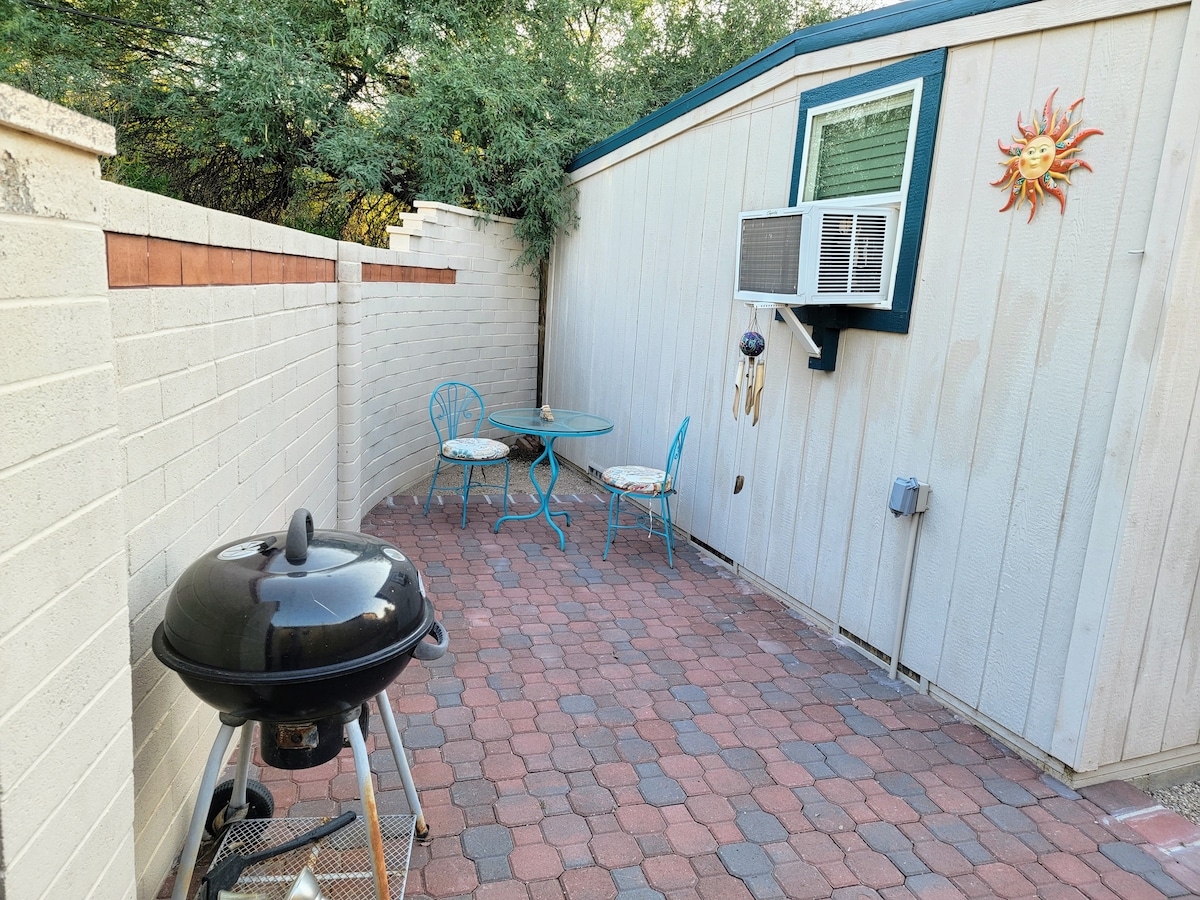 Perfect for a weekend getaway or a long-term stay, our casita in midtown is fully equipped with everything you need to experience all that Tucson has to offer. 344 sq ft, this small and mighty space offers a fully-equipped kitchenette, theater-quality entertainment center, high speed wifi access, and washer and dryer access. Enjoy the spacious patio while you sip morning coffee or grill in the evening. You may find it hard to check-out of this cozy gem!
