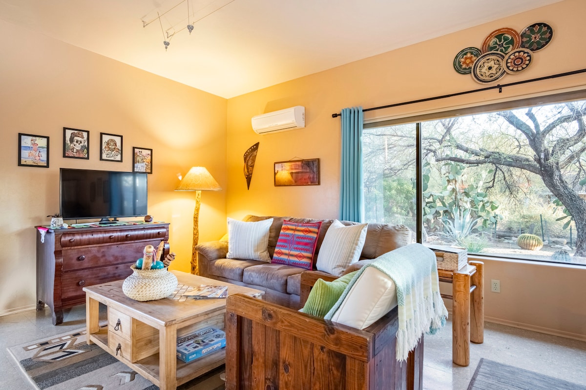 Newly renovated guest home located in a quiet central area in the Catalina Foothills. Trails and biking in our backyard, 10-15 min drive to hiking/parks, downtown and UofA! Away from everything and yet conveniently close to everything! Enjoy beautiful mountain views and professional landscaping. Well equipped kitchen with washer/dryer and a cozy fireplace and desk in the master bedroom. Lots of privacy from the main home. Stocked with all your amenities needed for a cozy and comfortable stay.