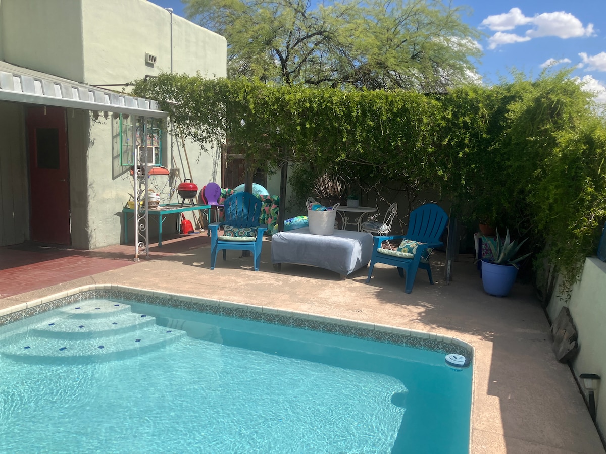 ☀Unique, Renovated Kitchen & Bath☀ 1930s 2 BR Sam Hughes house ☀SPA☀ 1 of Tucson's most walkable, safe & historic neighborhoods 2 blks 2 UA Airbnb won't let me give it the amount of stars it deserves!-a guest ☀ Custom design well stocked kitchen ☀ Large private enclosed yard +flowering garden ☀ Comfy beds for a good night's sleep! ☀ Roomy 1200 sqft ☀ Covered parking ☀ 9 yrs Superhosts! Families & couples enjoy our Hot tub & BBQ ★Anti-viral cleaning★ Welcome to our cheerful Tucson getaway!