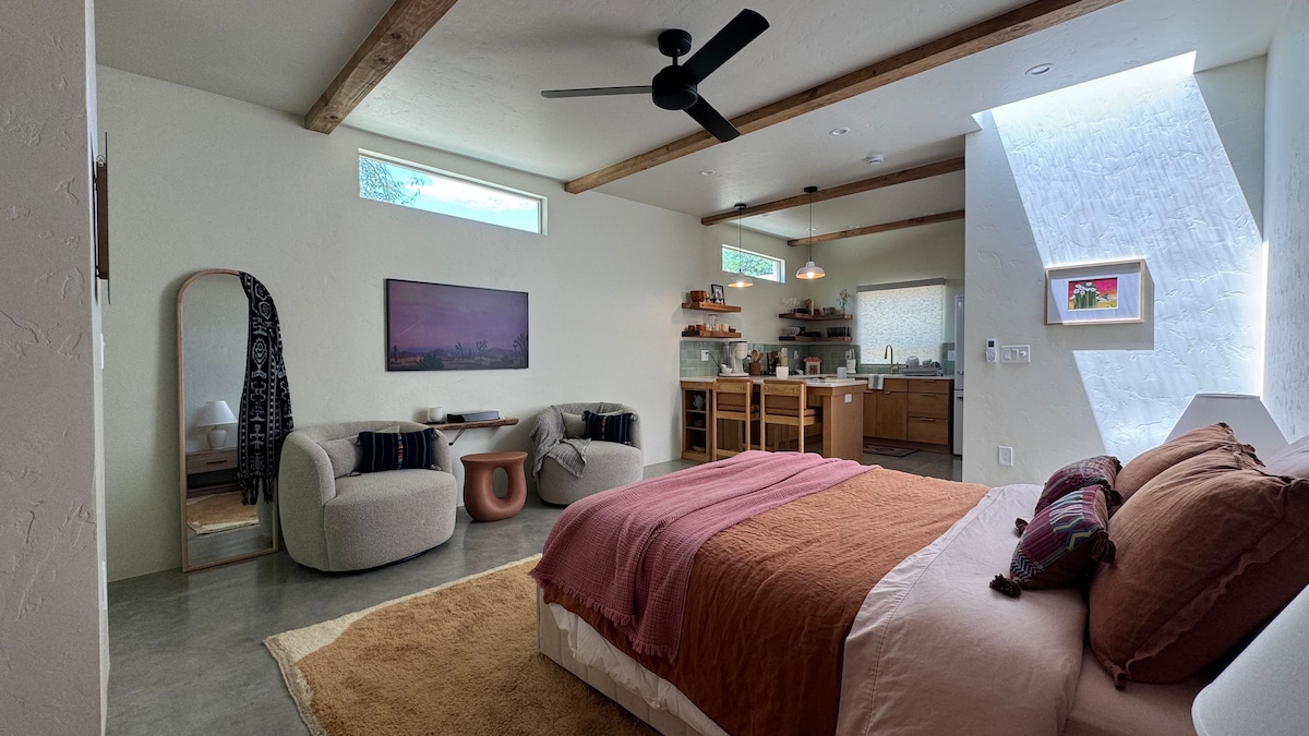 Tiny Home. Very private. Peaceful and quiet. Lots of land surrounding. Separate driveway And huge lot area. Dog Ok. NO CATS New, extremely comfortable Queen memory foam/gel mattress in the bedroom and brand new Queen memory foam mattress in the pull out couch. This is the perfect little HOuse in the Desert and brand new! We are available to you and very close in the main house on the other side of the property. The houses are separated by a large brick wall.