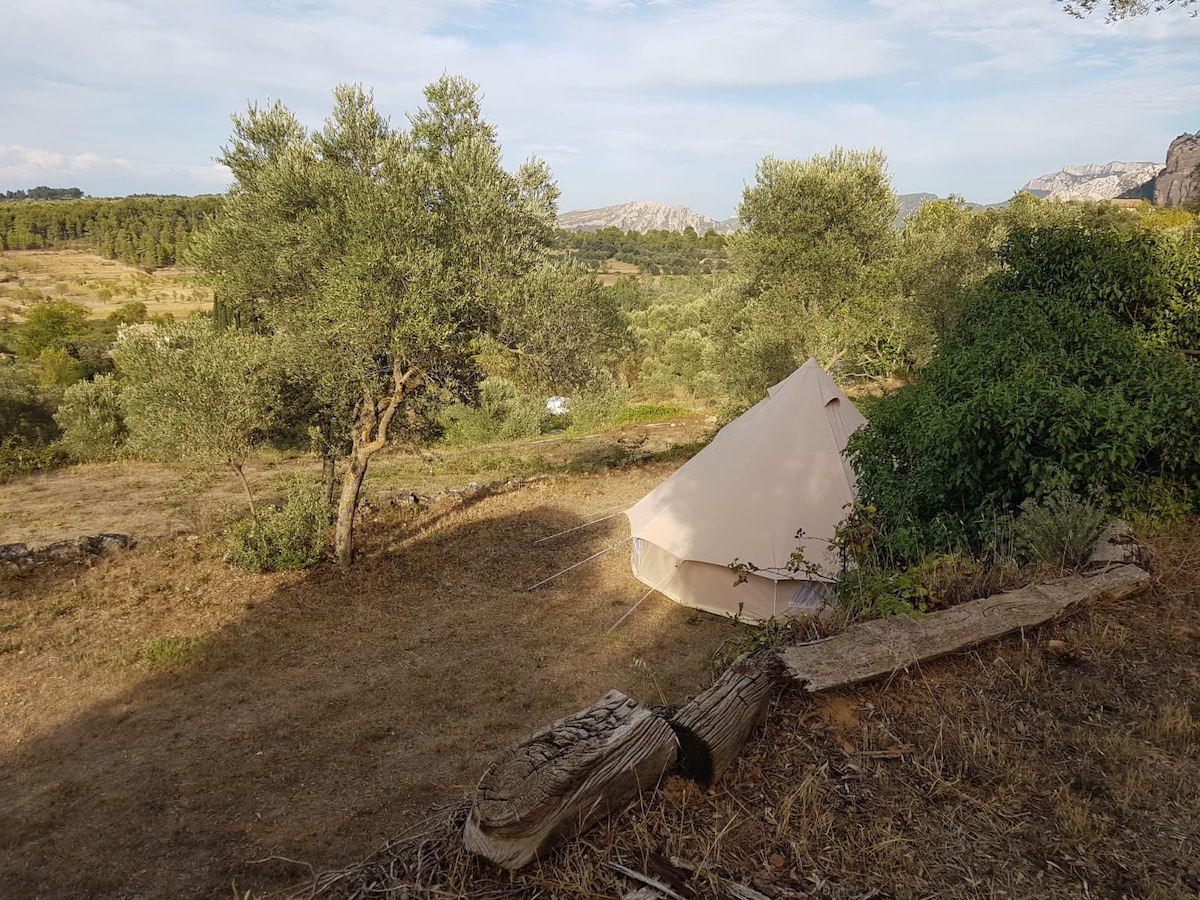 Bell tent voor 2 pers. op ruime plek met vrij uitzicht,vlakbij toiletgebouw. Incl 2 bedden met schuimmatrassen 190x90, poefjes,2 stoelen,tafel,electra, koelkastje en kleine lampjes. In de natuur, maar toch slechts 10 minuten lopen van het gezellige dorp Horta de sant joan.Aan de autovrije wandel-en fietsroute Via Verde en aan natuurpark Els Ports. Terrascamping dus vrij uitzicht . Alleen 14+. Gratis gebruik van warm water, boeken, spellen, zwembad,petanca,terras,BBQ ,buitenkeuken en Wifi.