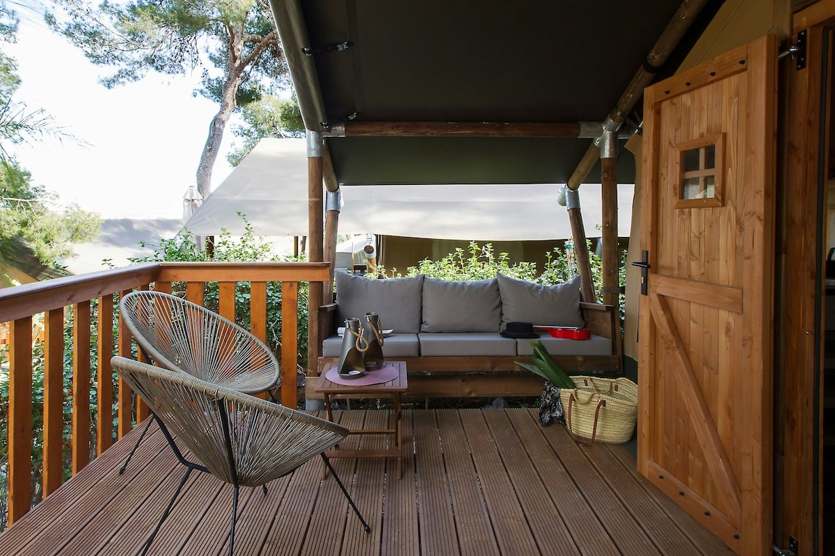 Tiendas glamping situadas en la parte media-alta del resort. Capacidad para 4 personas. Disponen de dos dormitorios, uno con cama de matrimonio (150x200) y otro con litera de camas individuales (80x200); cocina equipada. Terraza cubierta con sofá y mesa de madera para pícnic. No dispone de baño pero sí de agua corriente, deben utilizarse los baños y duchas de la zona común de acampada. Sábanas y toallas no incluidas (ofrecemos servicio de alquiler). No se aceptan mascotas.
