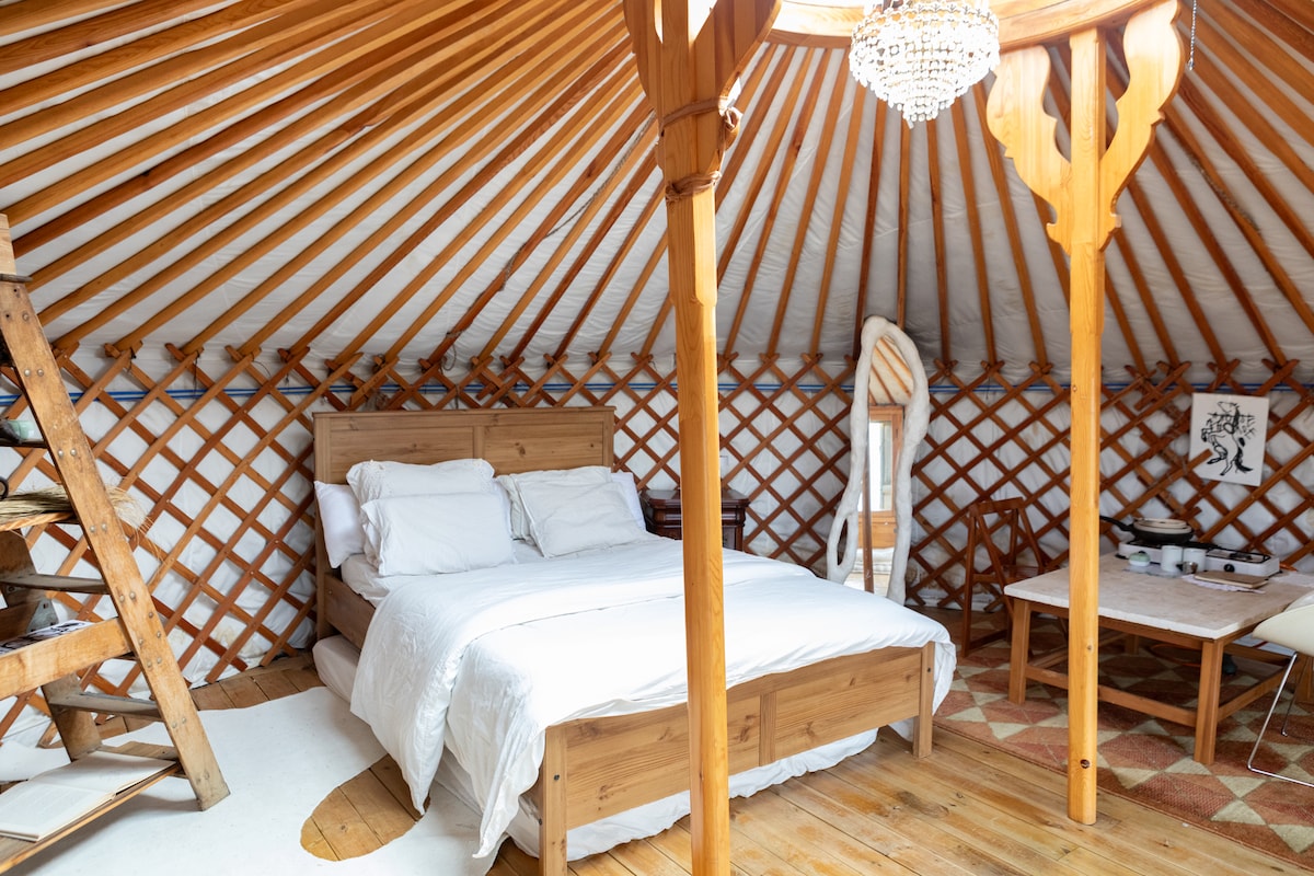 La Yurta mongóla es la construcción típica de los pastores nómadas de la estepa mongola . Es una casa circular completamente diáfana de 40 m2 con una cúpula central a través de la cual se ve el cielo y las estrellas . La construcción esta hecha de forma artesanal y en madera ecológica . Cuenta con una estufa de llama para calentarla en invierno .Y una decoración Zen que cuenta con una autentico Tatami Japones para dormir , tatamis tailandeses para descansar y alfombra persa .