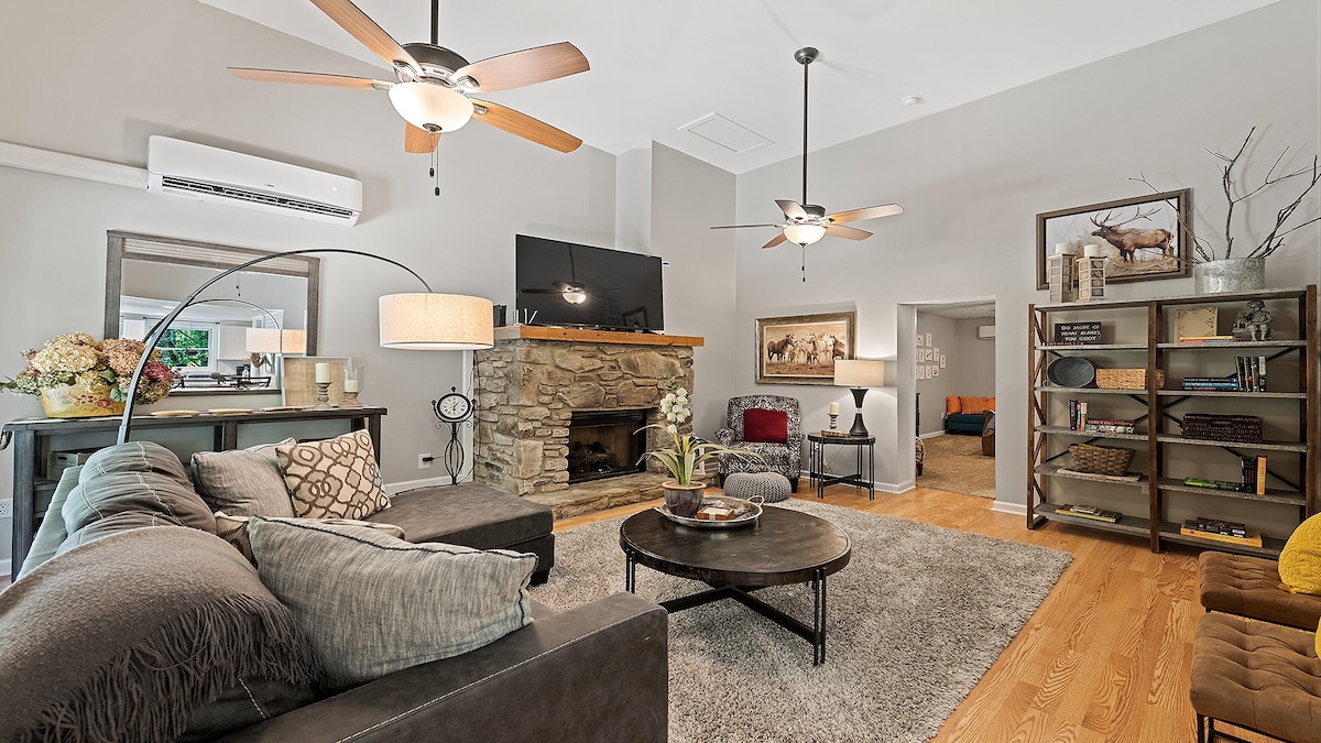 High Calling is the lower level of a home on Cataloochee Mountain, at 4300’ elevation. Enjoy the panoramic views year round from a private covered porch or around the fire pit as you relax with the peaceful sound of the creek below. A charcoal grill is also provided. Two bedrooms, one with a queen size bed, the other with one full bed and one twin bed face mountain views. A sitting area with a television and games, kitchenette and coffee station are provided, along with snacks and drinks.