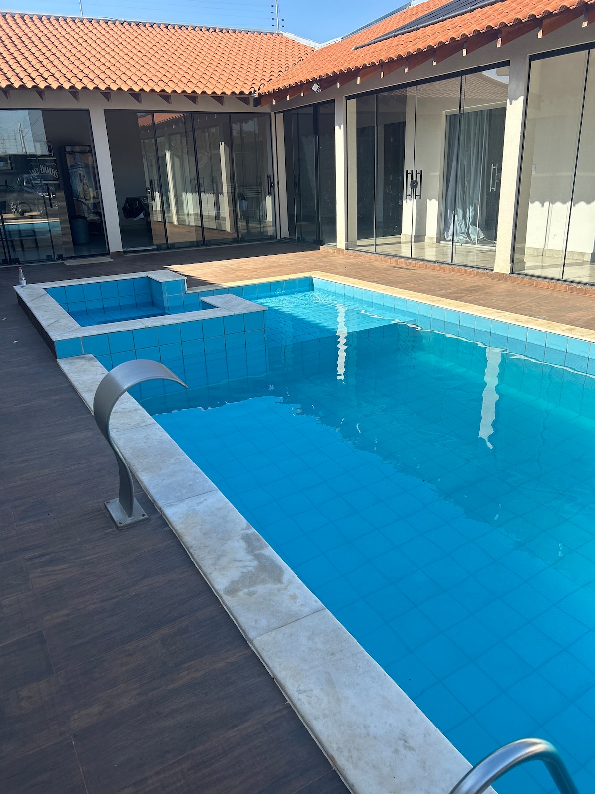 Nossa casa oferece uma estrutura completa para lazer e convivência: área de churrasco com duas churrasqueiras, mesas para grupos e som ambiente; cozinha equipada com cervejeiras, geladeira, fogão e Wi-Fi; projetor com telão; piscina com cascata e hidromassagem; dois banheiros amplos; e um quarto com camas e colchões extras. Ideal para eventos e descanso. Não oferecemos roupas de cama e banho.