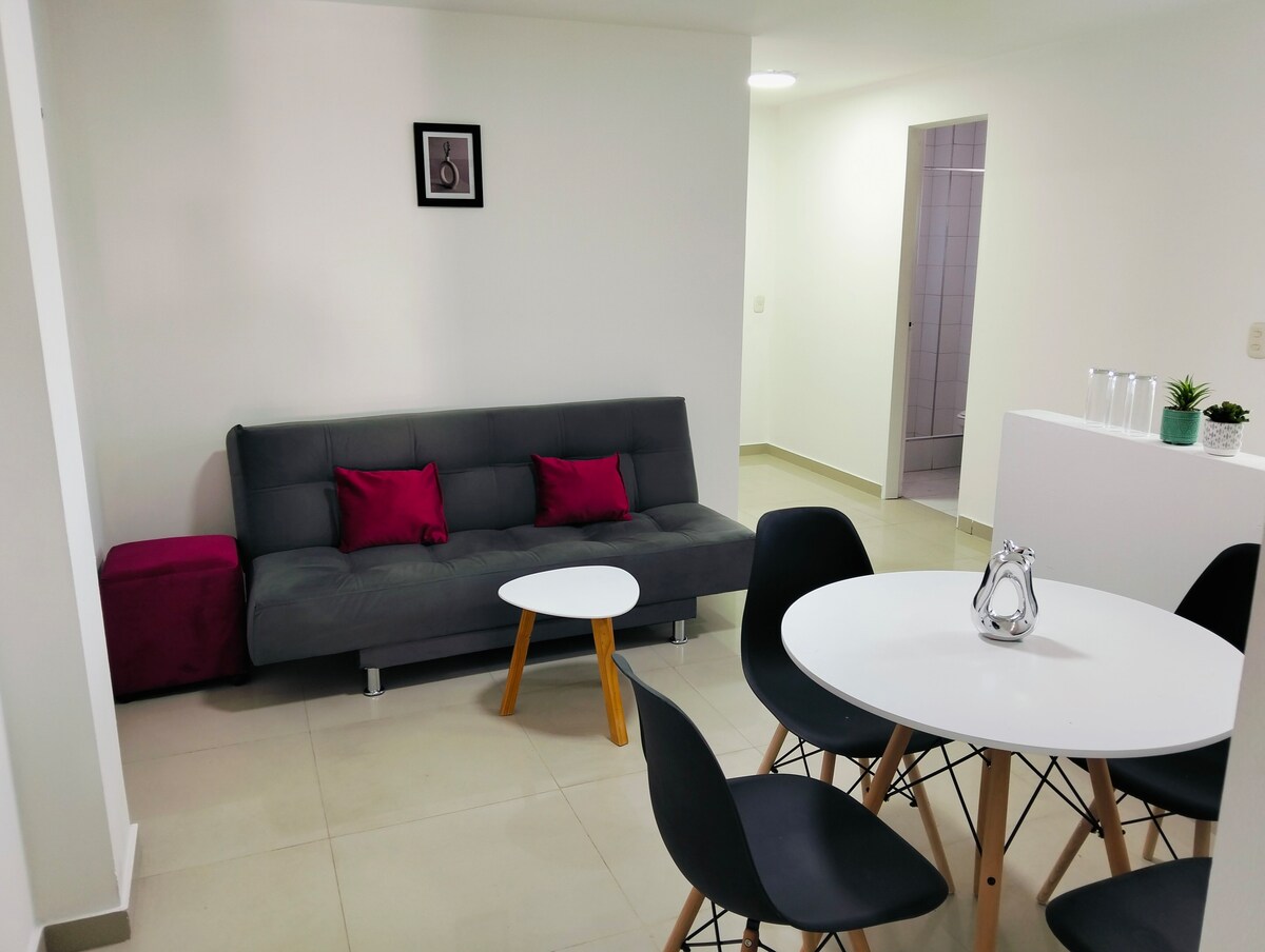 Apartamento totalmente privado con hermosos acabados. Aloja 4 personas en una cama doble y un sofá-cama doble, cuenta con baño privado con agua caliente, smart TV, WiFi, cocina integral, sala-comedor y lavadora. Parqueadero gratis en el edificio. Disfruta de la elegancia, iluminación y confort de este alojamiento tranquilo y céntrico. Cerca al terminal de transporte, salitre, centro comercial multiplaza, plaza claro, con transporte público, parques y almacenes de marcas importantes cerca.