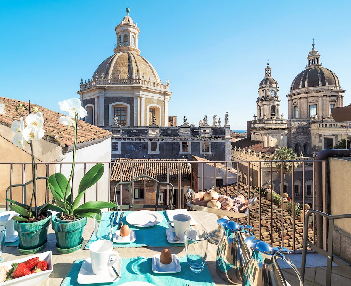 Elegante attico di 135mq nel cuore del Barocco catanese, servito da ascensore, con terrazza panoramica su via Etnea, piazza Università. L'appartamento si compone di ampia zona giorno, con cucina attrezzata (lavastoviglie, forno, piano ad induzione, macchina del caffè), e due ampie suites matrimoniali con bagno privato. Dotato di aria condizionata/riscaldamento, WIFI, TV in ogni stanza, lavabiancheria, asciugacapelli, è stato interamente ristrutturato con uno stile ricercato, dal design moderno.