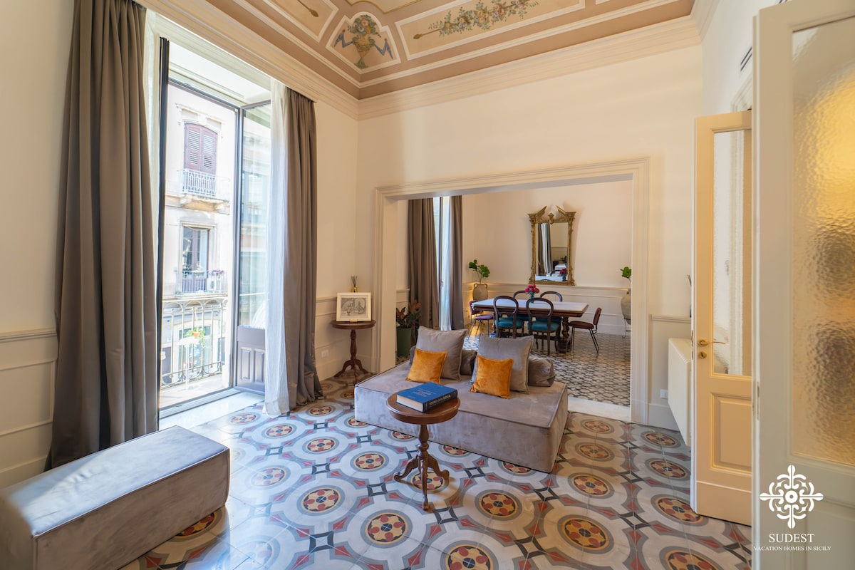 Enjoy a stylish holiday in this exclusive apartment in the historic centre, on the main floor of Palazzo Mannino: the ancient 5m high frescoed ceilings and the view on via Etnea make it unique. Active since May 2022 and now managed directly by the owner, it is located on the third floor without a lift. It consists of 2 double bedrooms (one with bed + sofa bed), 2 bathrooms, large kitchen, small terrace and laundry. From the balcony you can admire the beauty of the Etna volcano.