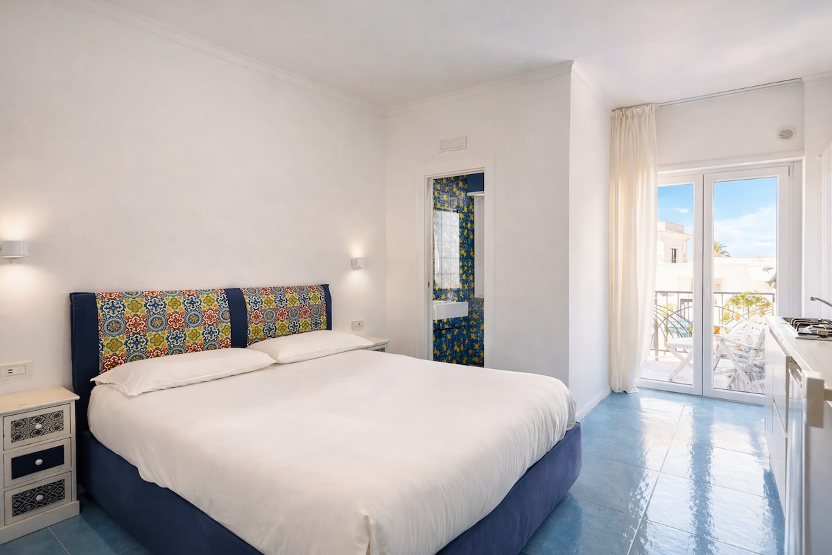 Bright and airy double room with stunning sea view and a terrace for unforgettable sunsets. A delicious breakfast buffet is included every morning. Relax by the pool or enjoy a drink at our Sunset Bar at dusk. Just 300 m from Anacapri bus terminal, perfect for reaching Capri, Marina Grande, Marina Piccola and Punta Carena Lighthouse. 24/7 lobby, always ready to share the best tips to explore the island.