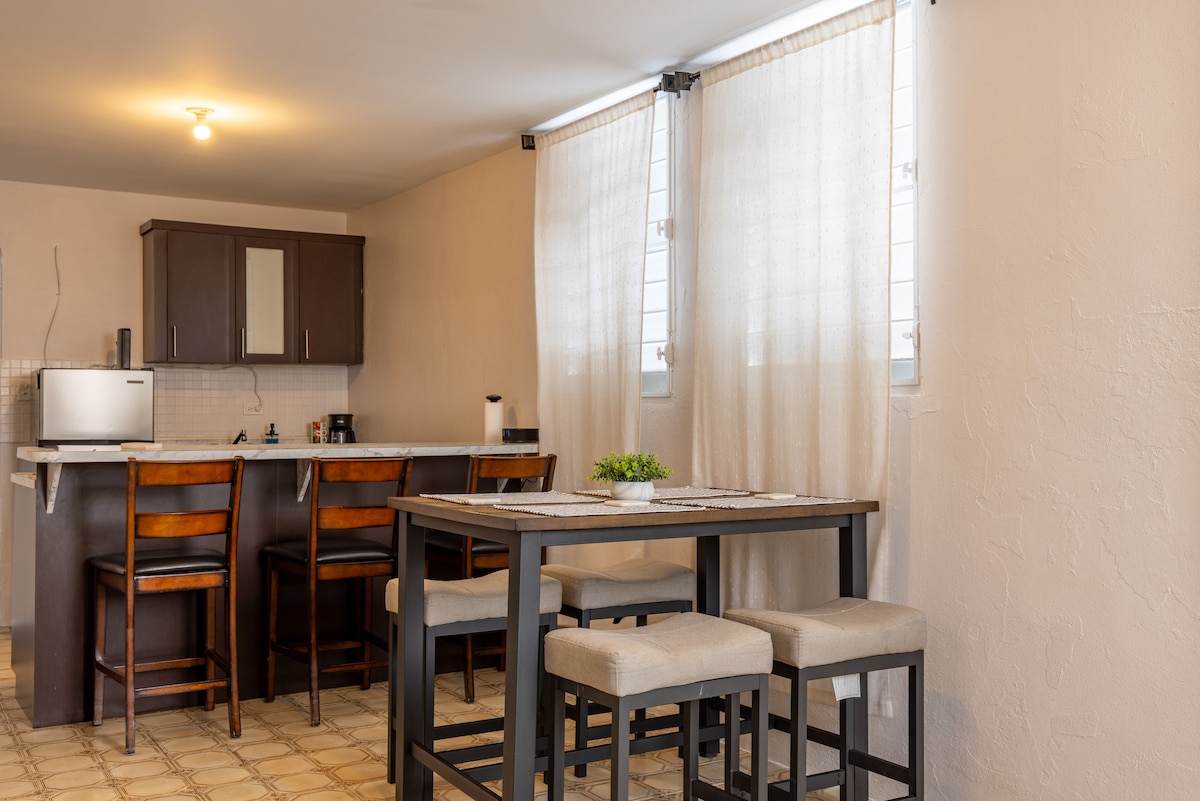 Es un apartamento de una habitación para dos personas. Es un lugar acogedor, moderno y consta de una cocina practica. Está en una localización a solo 14 millas del aeropuerto SJU, a solo minutos de casinos, supermercados, playas, centros comerciales, hospitales, iglesias y lugares turísticos.