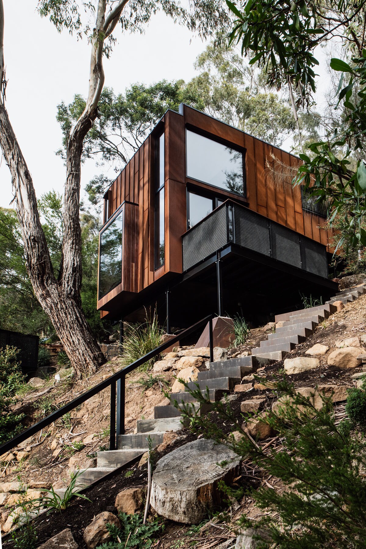 #birdhousestudiostas are two modern unique architectural, one bedroom houses hovering on a steeply sloping site with extraordinary views to the east over Launceston and the mountains beyond. Each studio has an individual personality inspired by the qualities of its site and a desire to create a sustainable buildings with the lowest possible carbon footprint and environmental impact. This accomodation will appeal to those with a design interest in architecture.