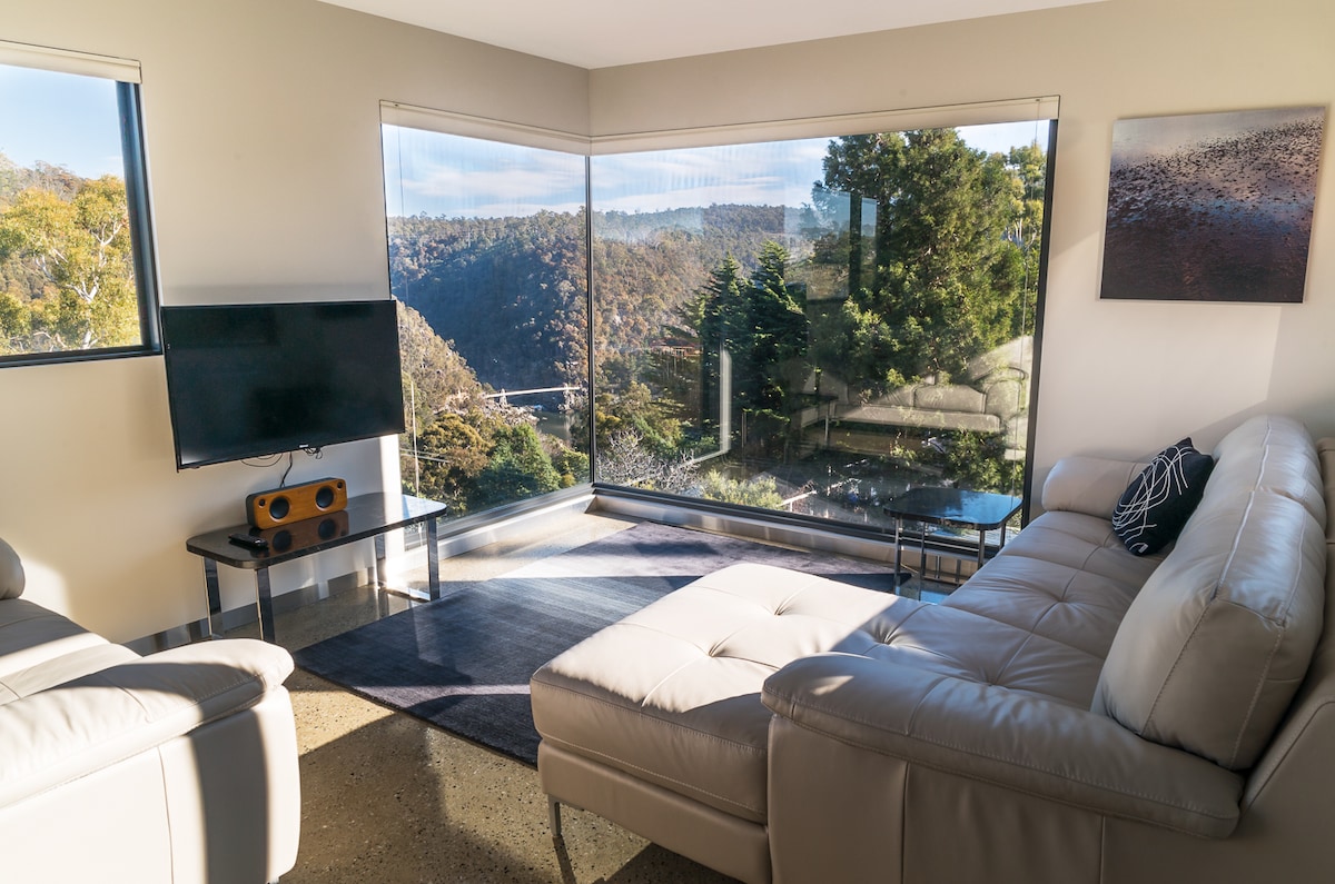 Contemporary, elegant architecturally designed accommodation at the highest of standards. Perched with breathtaking scenes of Launceston's iconic Cataract Gorge suspension bridge. Quality modern living within a cosy spacious one bedroom apartment with multi views perfect for a romantic getaway, business trip or timeout. Sited in a private street, a short walk into the cataract reserve. A 3 minute drive to Launceston's CBD to discover fine food, wine and shopping in elegant architecture.