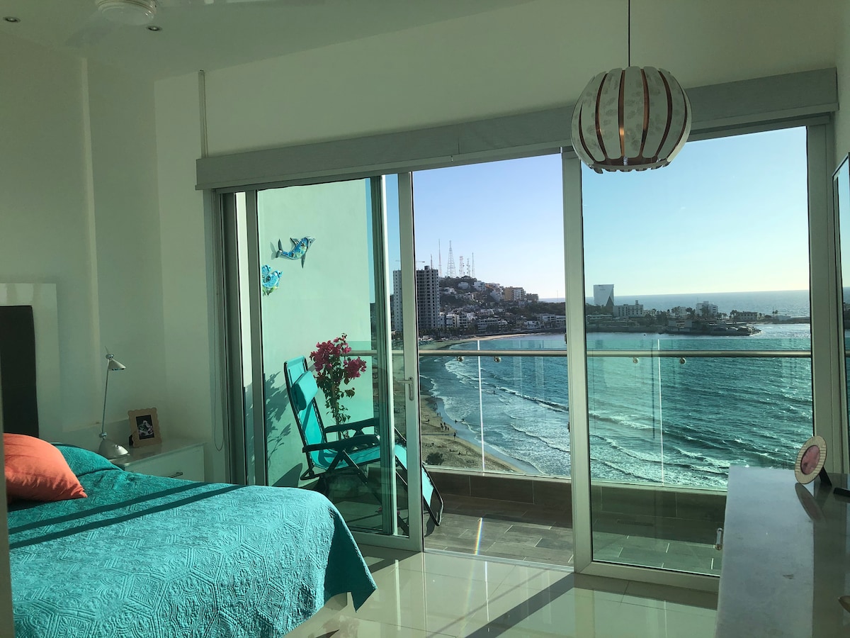 A Guest Favorite for Best Views in Town, centrally located on the Beach Front, among the most sought after Condos in Mazatlan, with an impeccable seven year rental history. Corner Suite on the 14th Floor, Amazing Panoramic Views of Ocean, Beach and City. Walk down to the Sandy Beach, Malecon Boardwalk and Restaurants. Starbucks, OXXO convenience store and Pizza Hut located on the first floor. Pool, Gym, Parking and 24/7 Security... An Absolutely Impressive Beach Front Condo Experience.