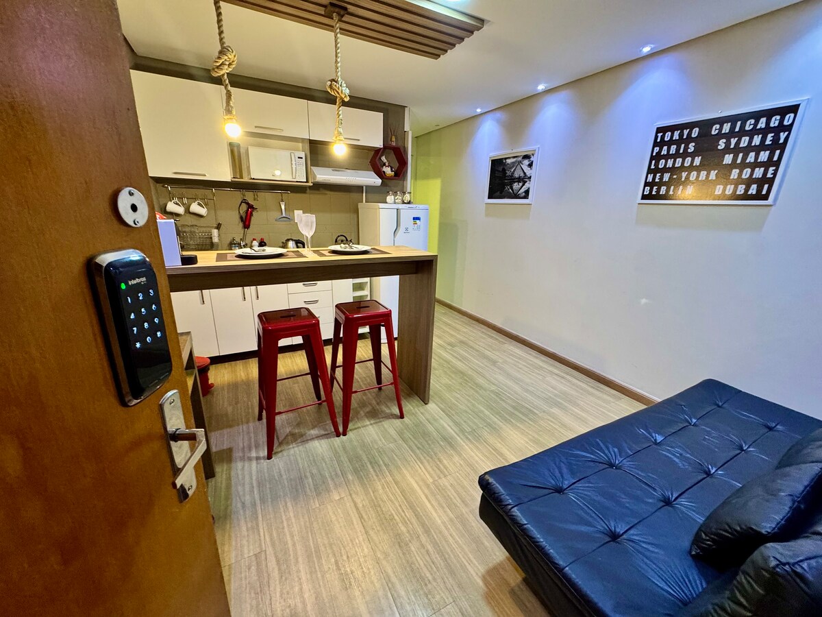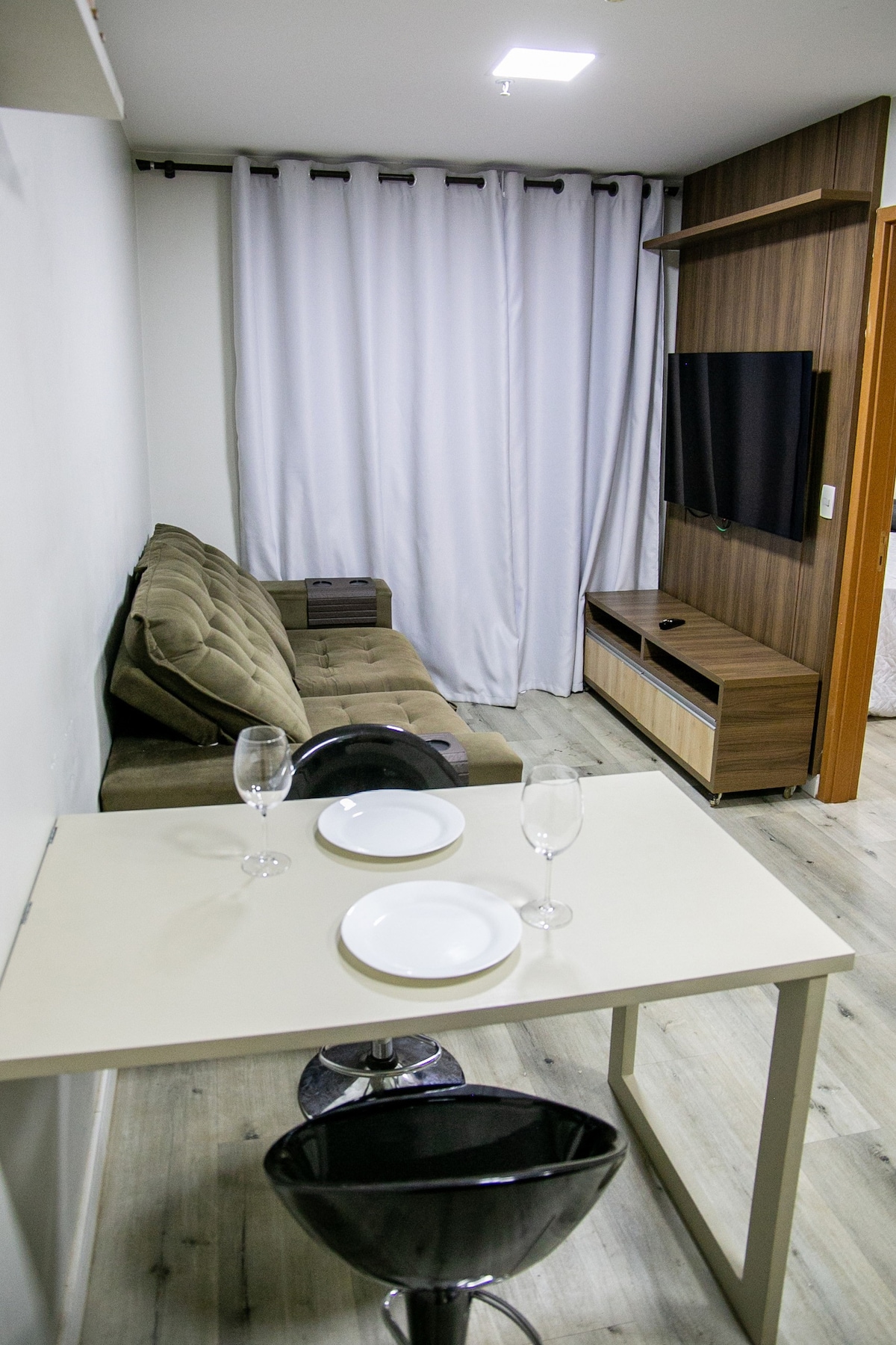 Apartment in a condo with resort facilities, balcony with pool view and equipped with: Wi-Fi. Parking space. Full kitchen (stove, oven, fridge, microwave, sandwich maker, blender). 50-inch 4K Smart TV. Bedroom with double bed and air conditioning. The condominium also has Huge swimming pool Children’s swimming pool Gym Spinning room Games room Multi-sports court Sand court Squash court 24-hour concierge 24-hour market in the building Laundry