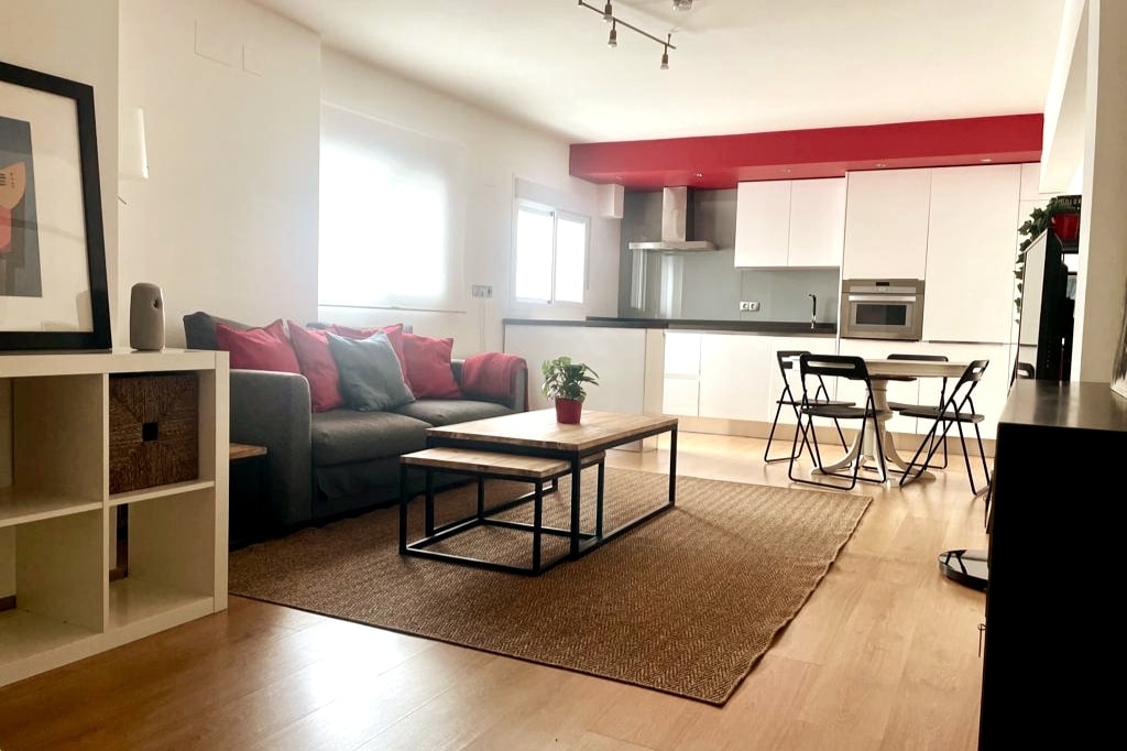 El COMEDOR-LINEA DE COCINA y SALÓN se funden armónicamente en un ambiente diáfano, presidiéndolo una gran mesa de madera con ocho sillas de diseño y equipado de una Smart TV con canales privados HBO y Netflix, altavoz Bluetooth. Dispone de un pequeño balcón a la calle Herbolarios.
