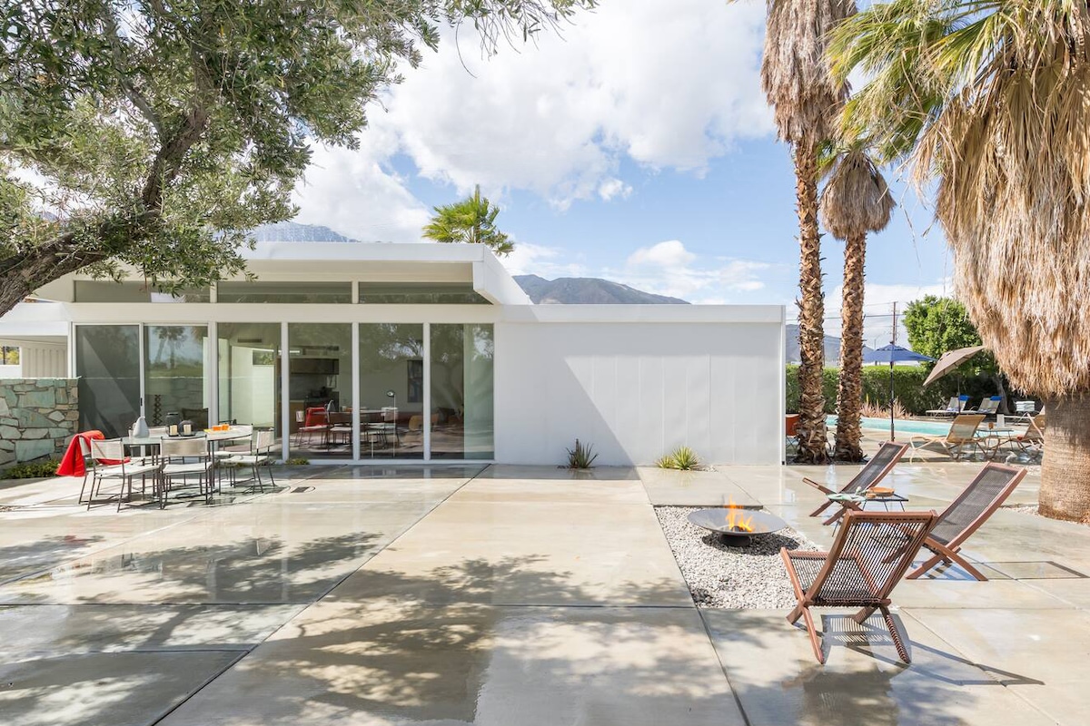 A modern desert escape with stunning mountain views, Ocotillo House blends relaxed luxury with thoughtful design. Soak up the sun by the saltwater pool and spa, gather around the fire pit at sunset, or enjoy dinner under the stars. With a private casita, rooftop deck, chef’s kitchen, and stylish outdoor living, it’s the perfect spot to unwind—just 3 minutes from downtown Palm Springs. Fast Wi-Fi makes it remote-work ready