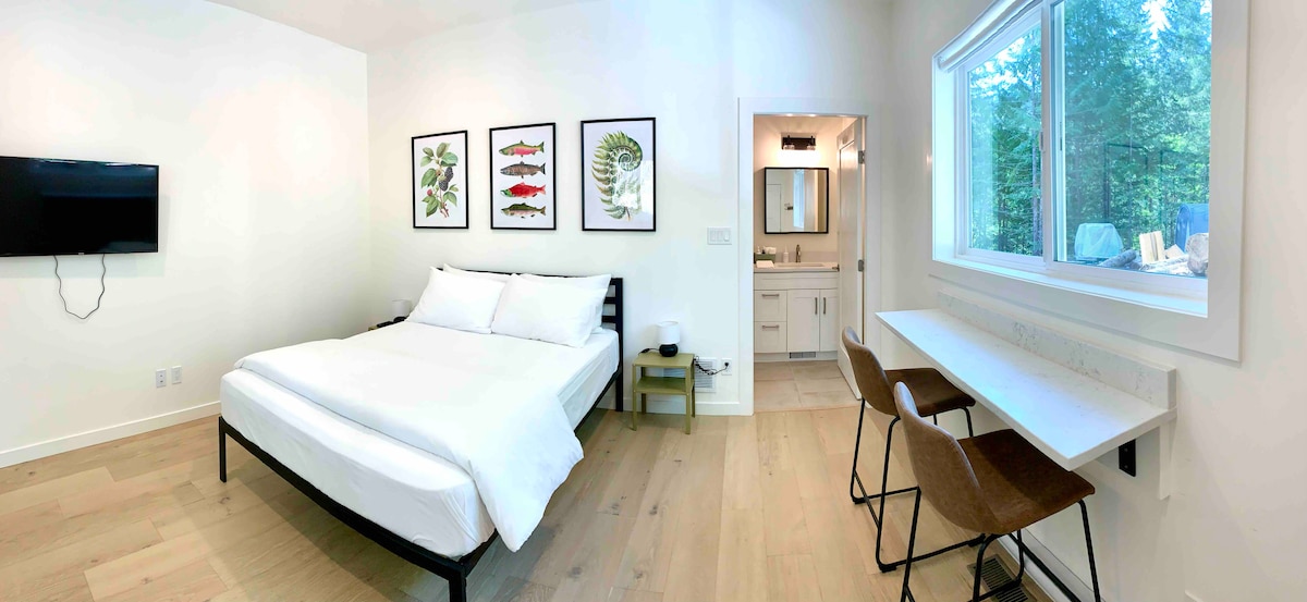 Sawing Logs Suite is a brand new (2023) hotel room style suite + kitchenette, BBQ and outdoor space -- ideally located in a rural setting on Sterling Arm of Sproat Lake and only 10 minutes from town. Suitable for individuals, couples or small families, for short or medium stays. Sawing Logs Suite is the perfect jumping off point for your Port Alberni and West Coast adventures. Pack N Play available for families traveling with infants.