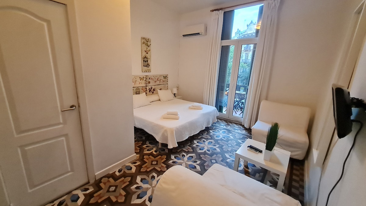 FACILITIES Complimentary Wifi in all rooms Complimentary Internet TV in all rooms Water Bottle Drinking water Wide screen 35” LCD TV with satelital channel Nespresso Machine Tea & coffee making facilities Room safe C.O. Bigelow Lavender amenities. Hair Dryer in all rooms Mini fridge Air Conditioning / Heating Other Information Bright and colorful mosaics floors, ceilings, made of stucco plaster and ornamented with gorgeous rosettes and moldings, remind you of the artistic context of the time and soft white furnishings. The room enjoy the benefit of a small balcony or terrace. you will enjoy: - from a balcony towards Gran Via as seen in the photos - a space to store your bags after check out Summer Front Desk: 09:00 am - 00:00 am Winter Front Desk: 09:00 am - 10:00 pm After time reception call us or send your personal email/whatsapp to send you details for autonomous late check in. BUHO Boutique is located at the very heart of Barcelona, between the Gothic, Born, and Eixample quarters. Start the day on one of Barcelona's main shopping avenues—only a five-minute walk away are Plaza Catalunya and the famous Las Ramblas. Buho Boutique Rooms has an excellent location in the centre of Barcelona. Airport, 20 minutes Cruise Ship Port, 15 minutes Train station (AVE), 10 minutes Beach, 25 minutes Paseo de Gracia, 5 minutes Casa Batlló, and La Pedrera, 5-10 minutes Cathedral, 10 minutes Gothic Quarter, 10 minutes Las Ramblas, 10 minutes Camp Nou, Futbol Club Barcelona Stadium, 20 minutes Private Parking: Saba Parking Urquinaona downstairs Just a few short steps from some of Barcelona's most emblematic historic buildings, BUHO Boutique is ideally located for exploring this magnificent city. The famous "Block of Discord", with several modernist constructions, including Gaudí's casa Batlló, is just a five minute walk, while "La Pedrera" is less than ten minutes away on foot. La Sagrada Família, Plaça Catalunya and the Ramblas are also within walking distance. A major metro station that is less than two blocks from the hotel lets you take adventage of Barcelona's superb public transit system.