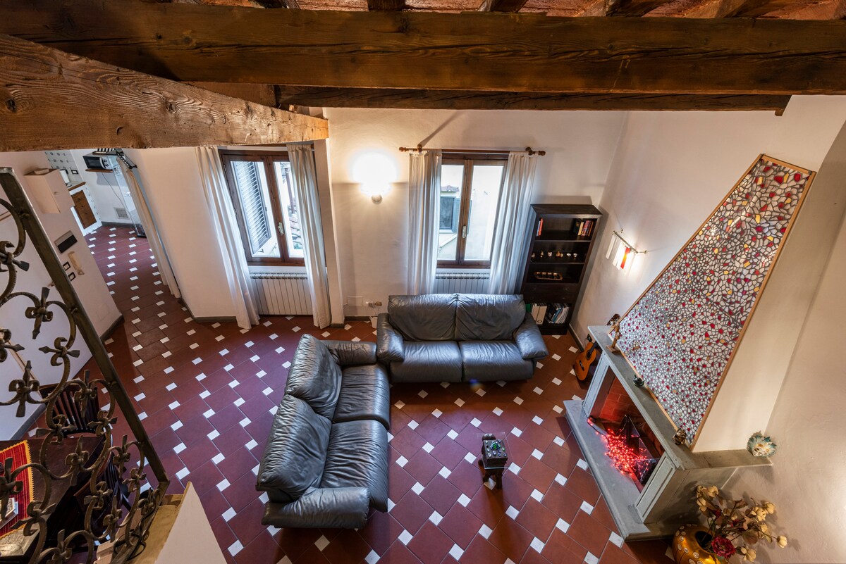 Embrace the contemporary chic aesthetics of this flat set in an historical space. The home features original structural wood beam ceilings, parquet floors, an expansive open concept layout. The property is located in the very center of the city. It is just 20 meters from the main square, Piazza della Signoria, and 200 meters from the Duomo cathedral. There are also many restaurants, cafes, and shops all nearby.