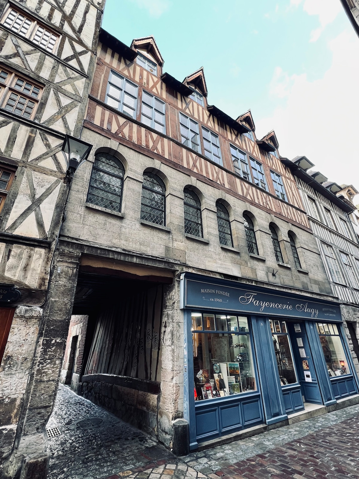 Situé dans l'hyper centre historique du quartier piéton dans l'une des rues les plus pittoresque de Rouen, notre appartement de charme et spacieux vous plongera dans l'univers médiéval typique de la ville au 100 clochers. A deux pas de la Cathédrale, de la magnifique église Saint Maclou et de son quartier des antiquaires, de la Rue Saint Romain et de ses commerçants pittoresques et de nombreux restaurants et cafés ou vous pourrez déguster les meilleurs pâtisseries de la région.