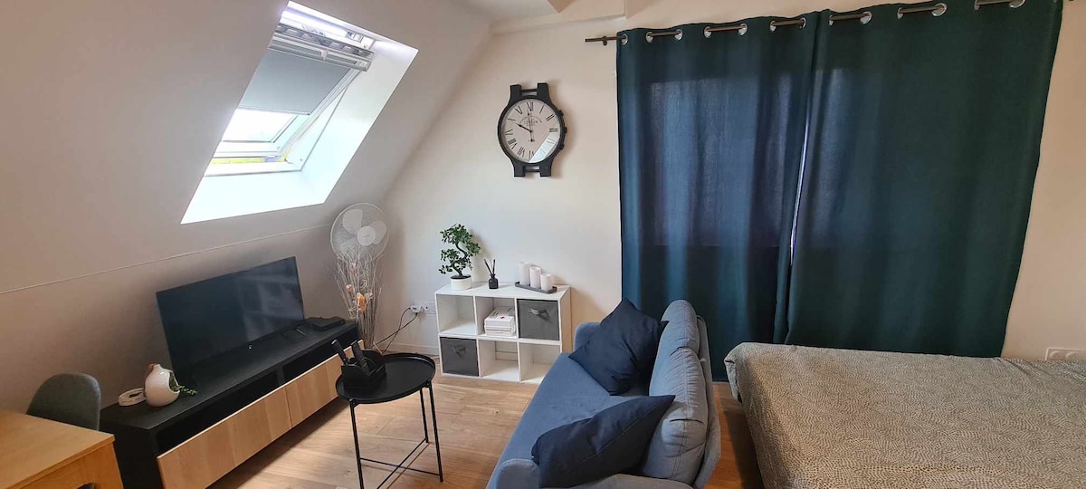 Charmant studio au cœur d’Orléans, idéalement situé près de la rue de Bourgogne et des principaux sites historiques. Entièrement équipé, il offre un coin nuit cosy, une kitchenette fonctionnelle (réfrigérateur, machine à laver, plaques, micro-ondes, machine à café), une SDB de moderne ouverte, le Wi-Fi haut débit et une télévision. Proche des transports, ce logement est parfait pour les voyageurs ou professionnels en quête de confort et de praticité. Propreté et accueil chaleureux garantis.