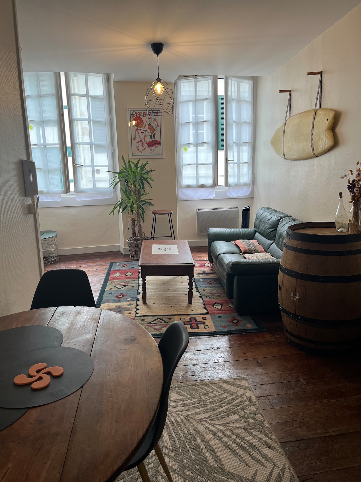 Charmant appartement dans le coeur historique de Bayonne au 4ème étage dans immeuble du 18ème siècle. Très lumineux avec une vue magnifique depuis le balcon sur la cathédrale. Idéal pour qui veut lier plaisirs de la plage et l'activité d'un quartier vivant à l'architecture exceptionnelle plein de restaurants et petits commerces de proximité. Secteur protégé et essentiellement piétonnier et à 11 minutes à pied d'un parking à 4€ / jour. Plages d'Anglet à 10 mns, Biarritz à 20 et l'Espagne à 40.