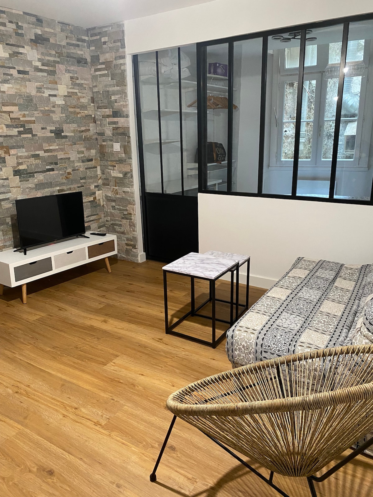 Logement de 25 m² accolé à notre maison, proche du centre d'Anglet. Il comprend un espace salon avec coin cuisine équipée, une salle d'eau, un WC indépendant et un coin nuit avec un lit en 140 cm. Vous pourrez également profiter d'une agréable terrasse ensoleillée. Un arrêt de bus se trouve à 20 mètres de la maison, où passe notamment la ligne 13 qui dessert les plages d'Anglet et la ligne 7 qui dessert la gare de Bayonne.